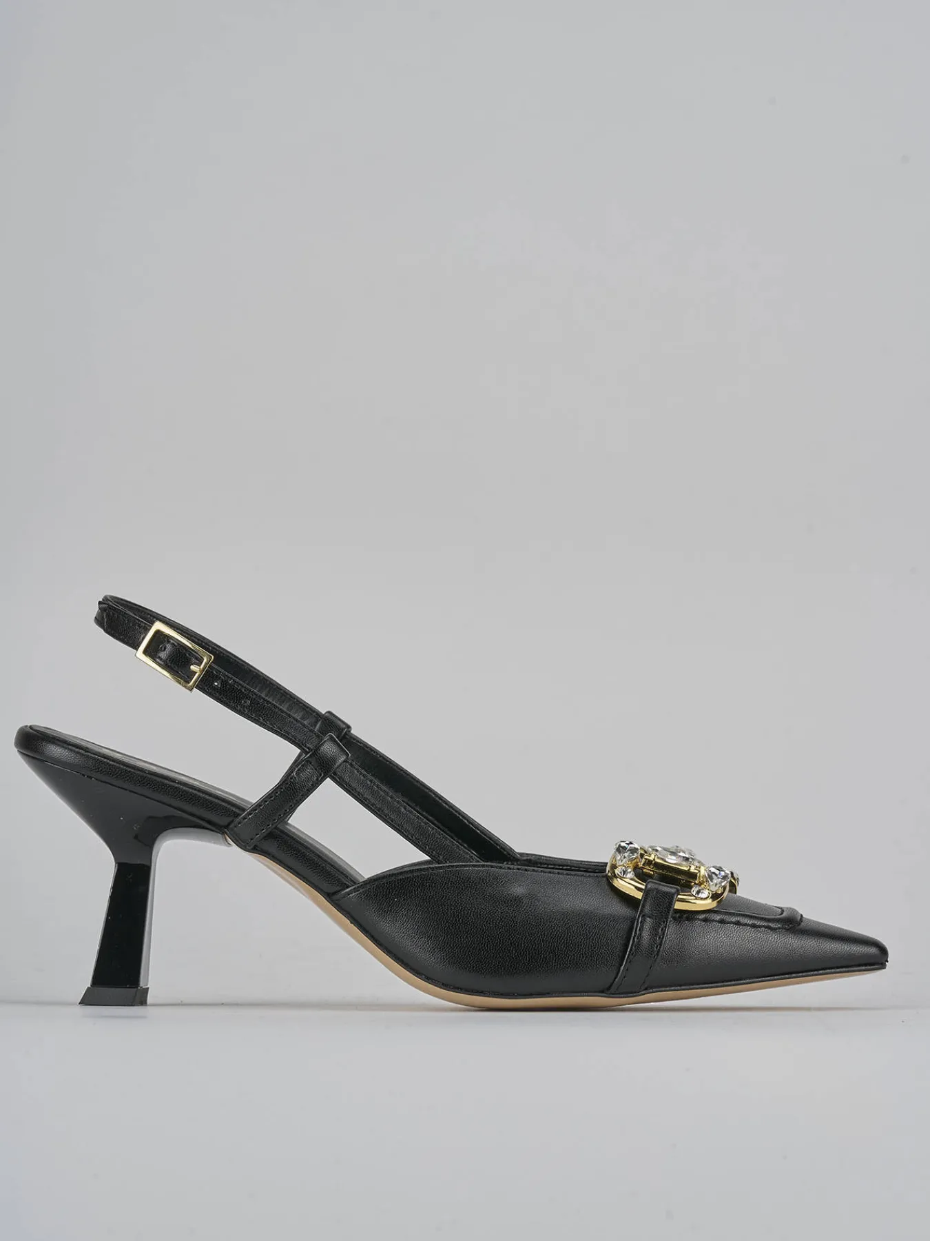 Slingback tacco 7 cm fondo in leggerissima gomma e soletto interno in vera pelle. Tomaia in morbida pelle, punta sfilata, scollo squadrato, cuciture a mano visibili, morsetto con pietre chiare e cinturino con fibbia regoalbile. Nuovissimo tacco rocchetto in materiale abs per un look cool.