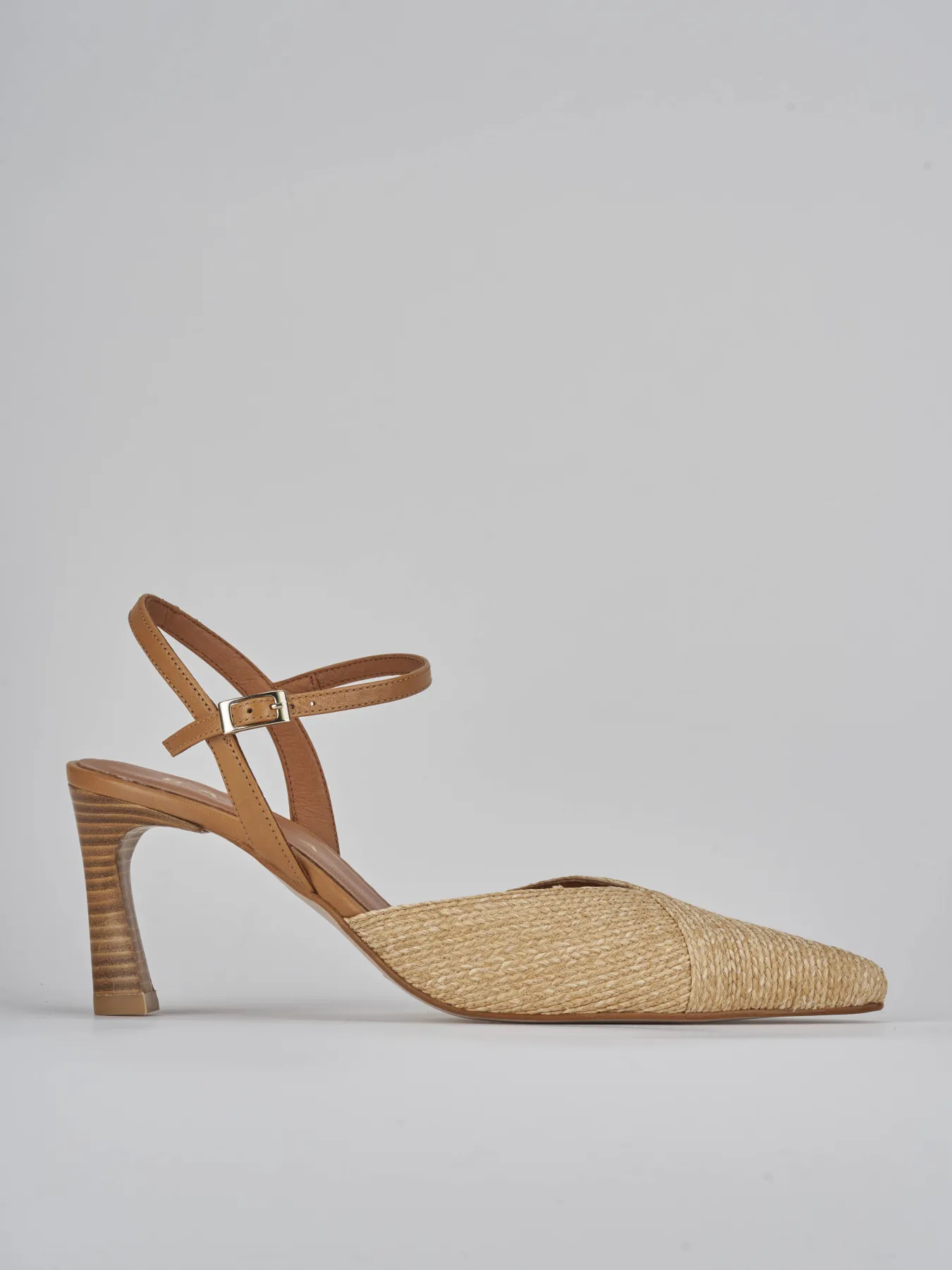 Slingback tacco 8 cm fondo in cuoio e soletto interno in vera pelle. tomaia in morbida pelle foderata in raffia, punta sfilata con scollo profondo a ‘V’, cinturino con fibbia regolabile e tacco rocchetto effetto legno per un look chic.