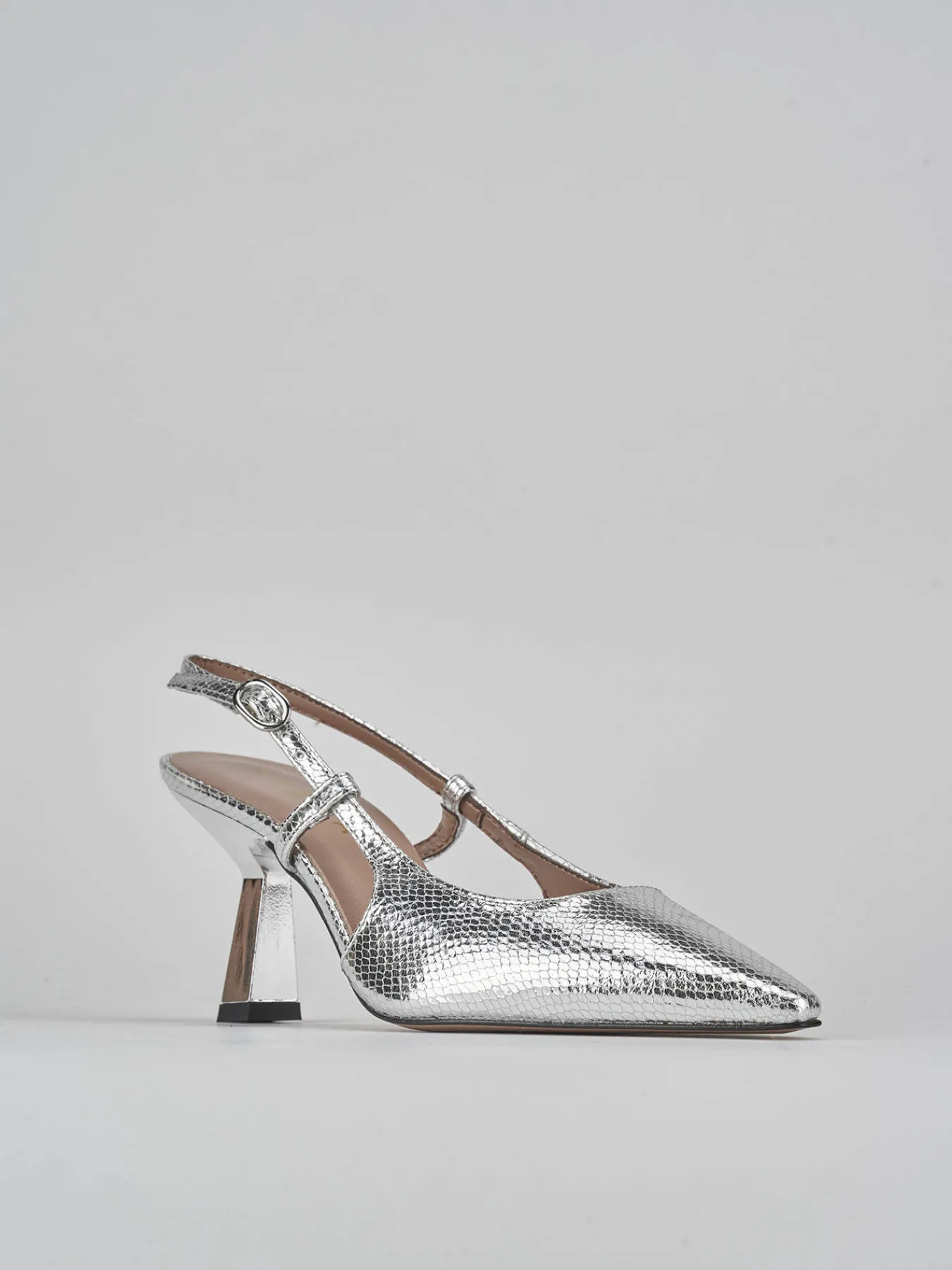 Slingback decolte’ tacco 7.5 cm fondo in cuoio e soletto interno in vera pelle. Tomaia in morbida pelle stampata effetto pitonato, punta sfilata, scollo squadrato, cinturino con fibbia regolabile e tacco rocchetto in materiale abs. Perfetto per le tue occasioni più speciali.