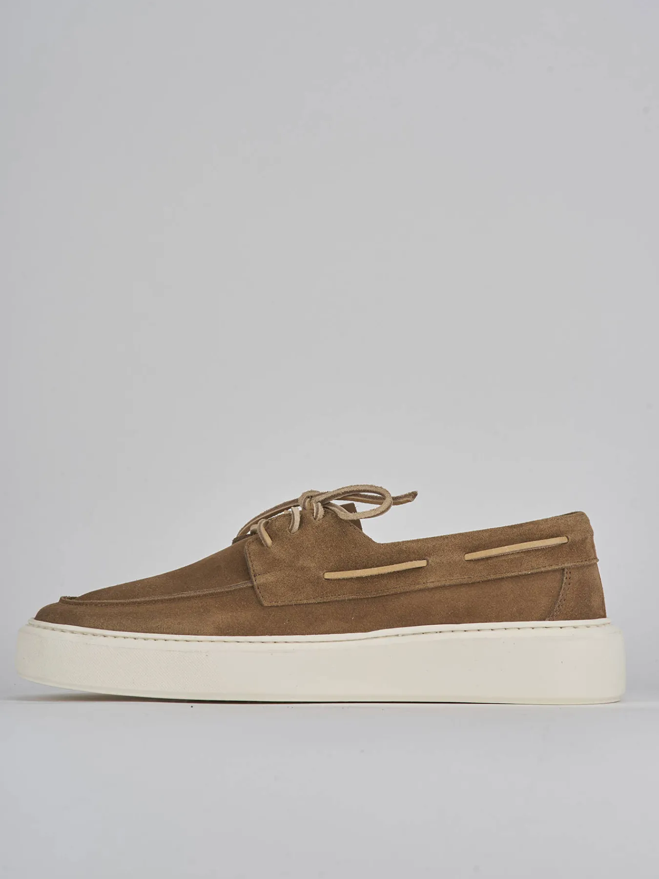 Realizzate in morbida pelle scamosciata, presentano una punta leggermente arrotondata e cuciture visibili che aggiungono un tocco di raffinatezza.