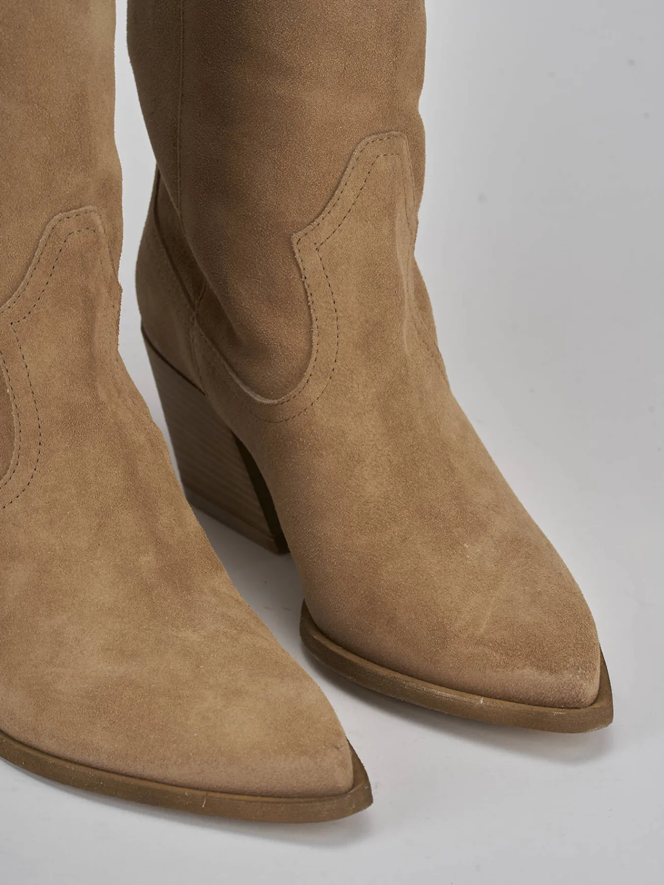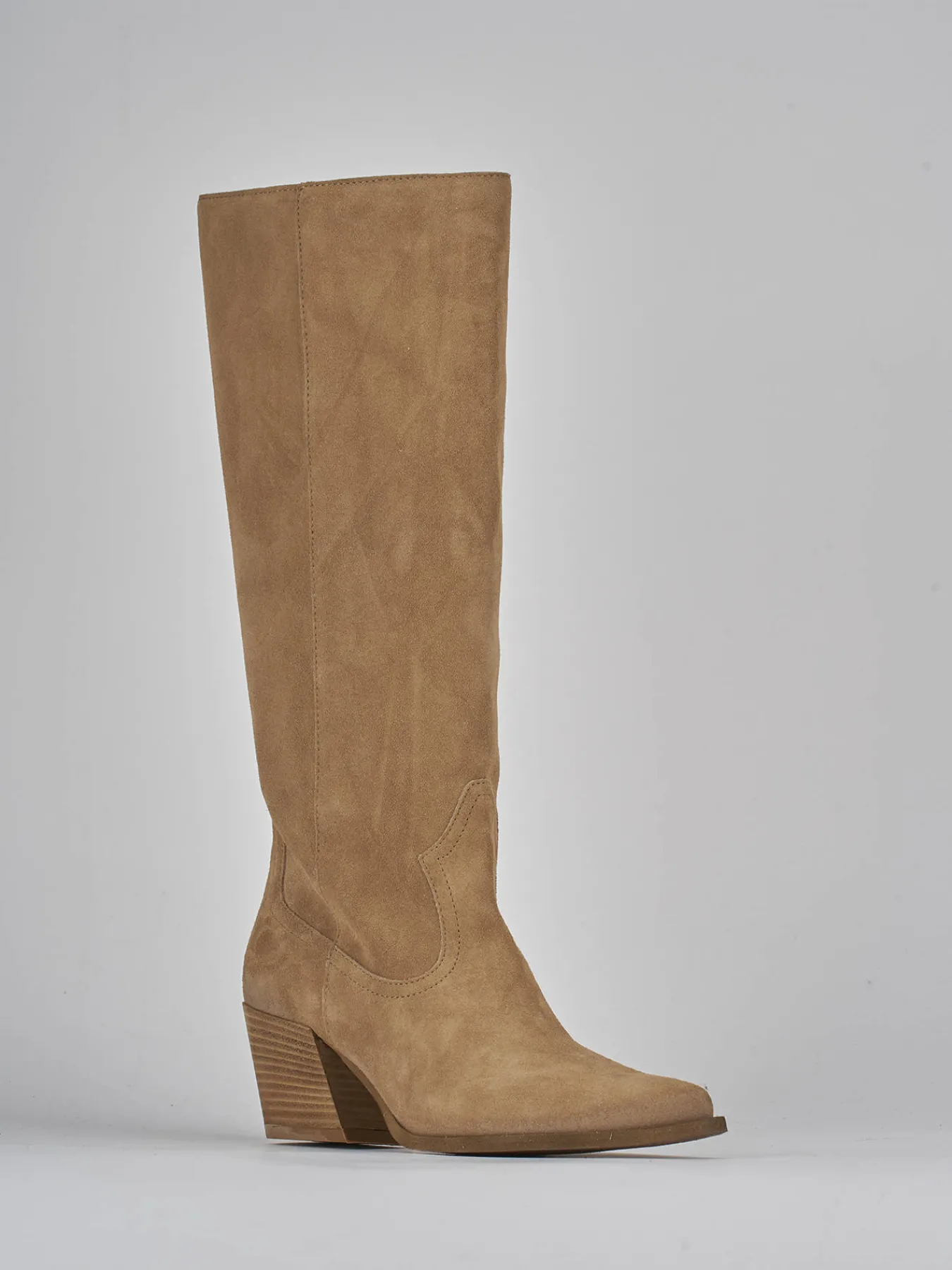 Stivale tacco 7 cm, fondo in gommaa e soletto interno in vera pelle. Tomaia in morbida pelle scamosciata, punta sfilata, liscio con cuciture visibili. Altezza gambale fino al ginocchio e stabile tacco grosso, adatto per ogni tuo look.