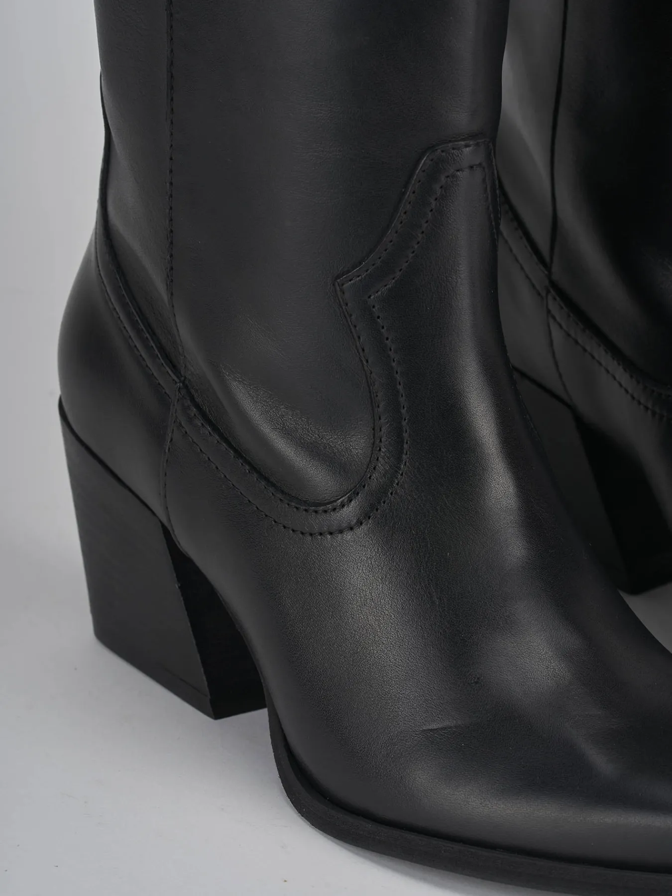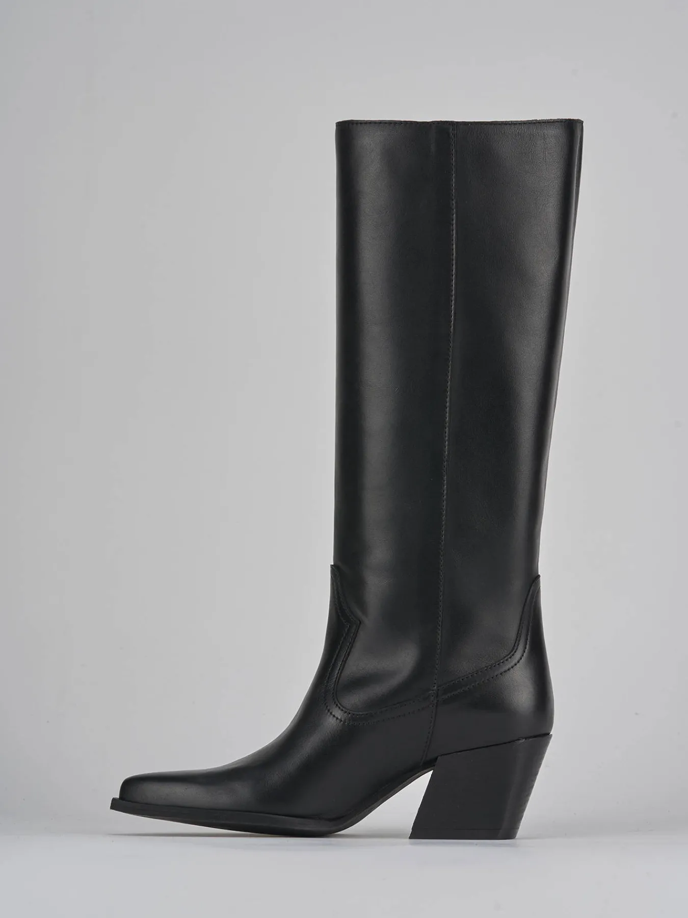 Stivale tacco 7 cm, fondo in gommaa e soletto interno in vera pelle. Tomaia in morbida pelle, punta sfilata, liscio con cuciture visibili. Altezza gambale fino al ginocchio e stabile tacco grosso, adatto per ogni tuo look.
