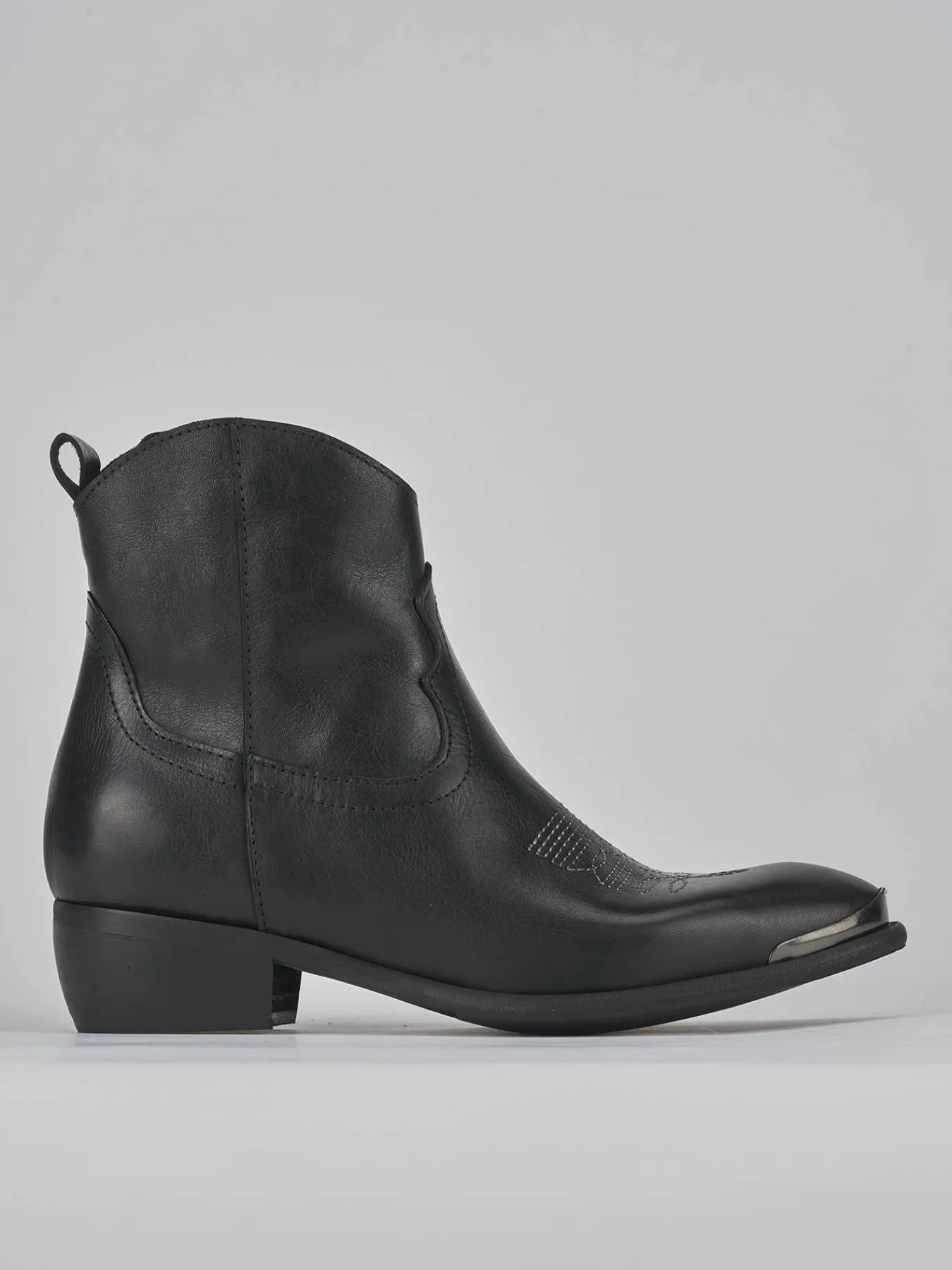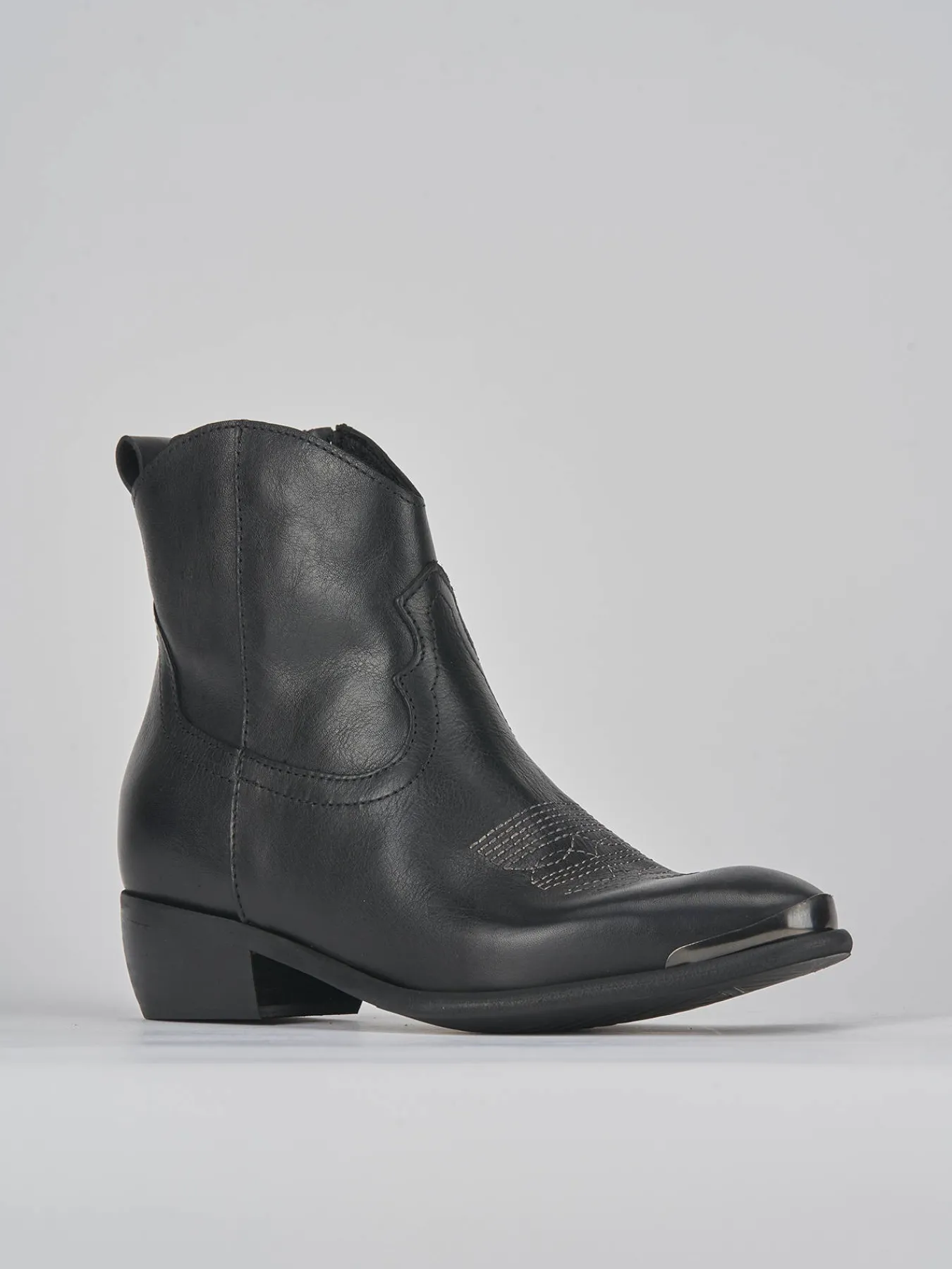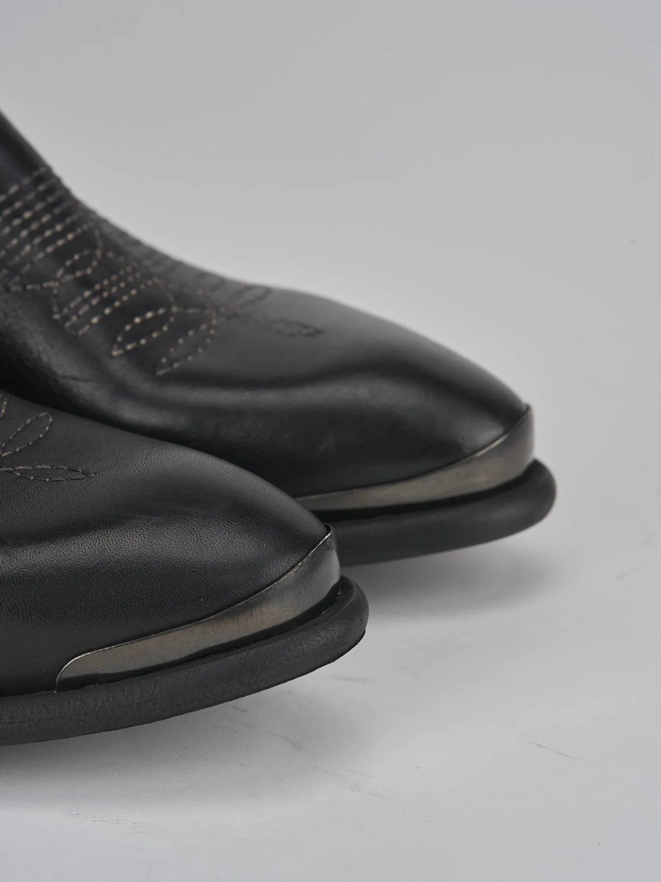 Stivaletto texano tacco 2 cm fondo in gomma e soletto interno in vera pelle. Tomaia in morbida pelle, punta sfilata con puntalino in metallo a rinforzo, ricamo abbinato sul collo del piede e cerniera laterale per un look texano veramente cool.
