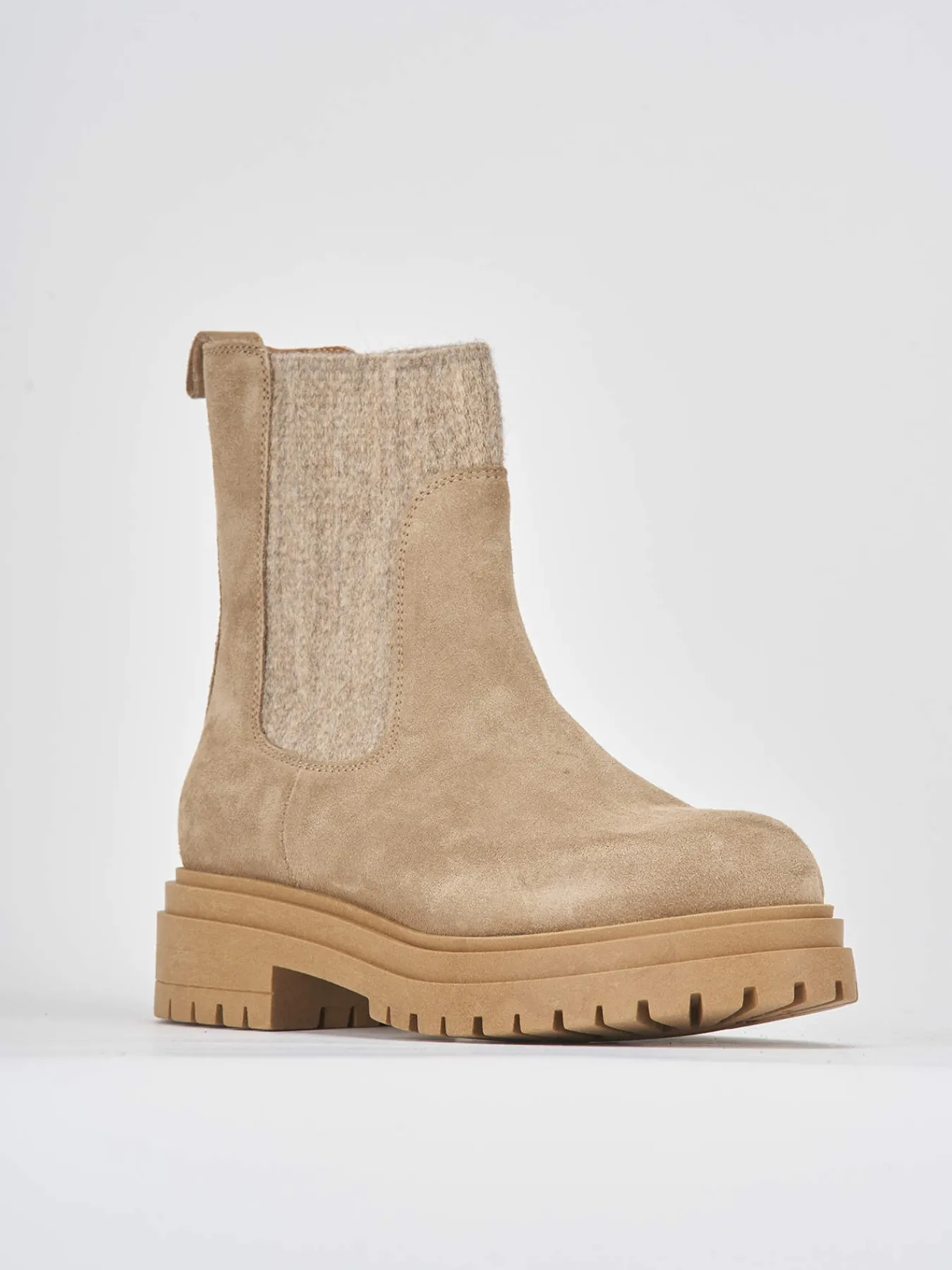 Stivaletto tacco 3 cm fondo in gomma e soletto interno in vera pelle. Tomaia in morbido camoscio, punta tonda, cuciture visibili e lati elasticizzati in tessuto. perfetti con una gonna e camicia bianca.