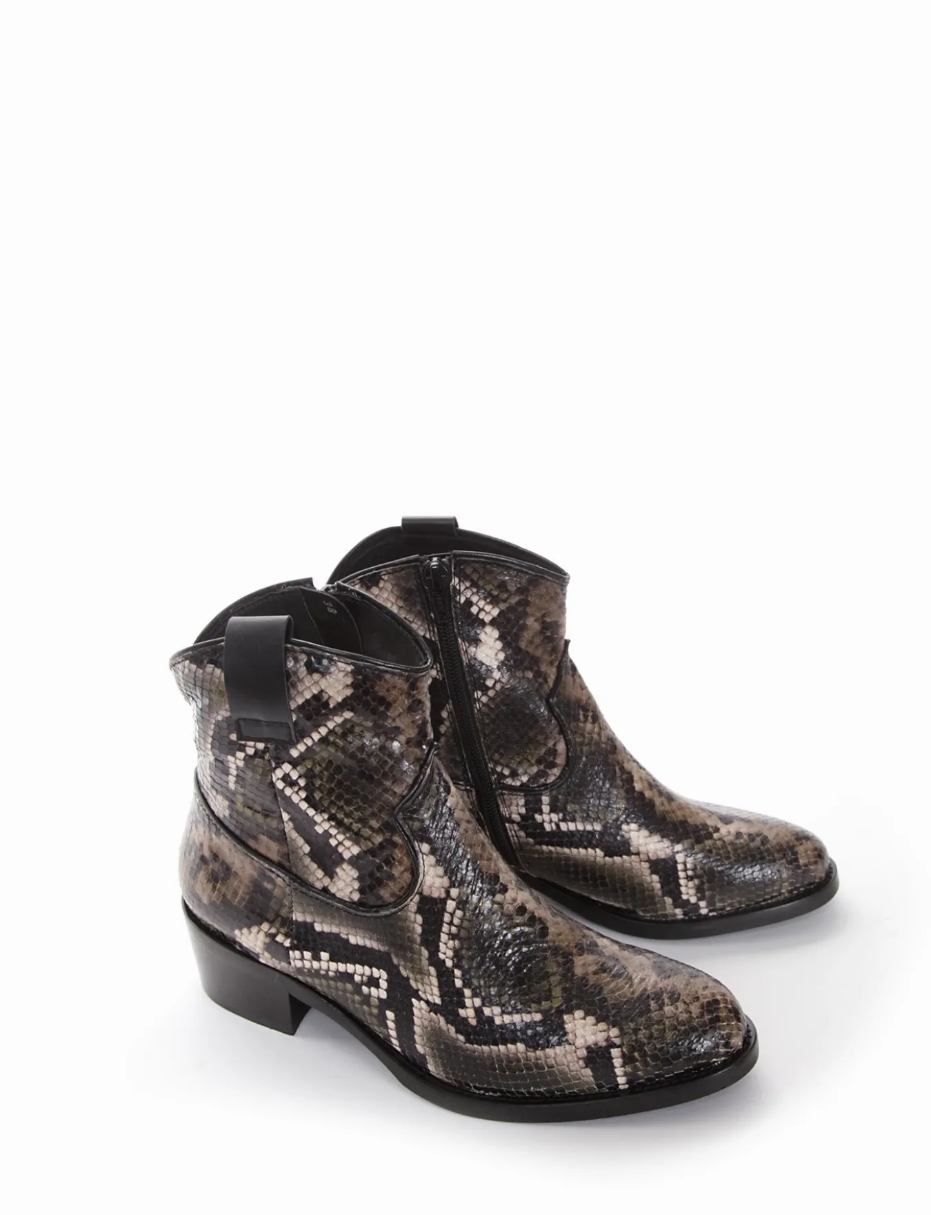 stivaletto texano tacco 3 cm, fondo in cuoio e soletto interno in vera pelle. Tomaia in morbidissima pelle pitonata punta leggermente sfilata e cerniera lato interno.