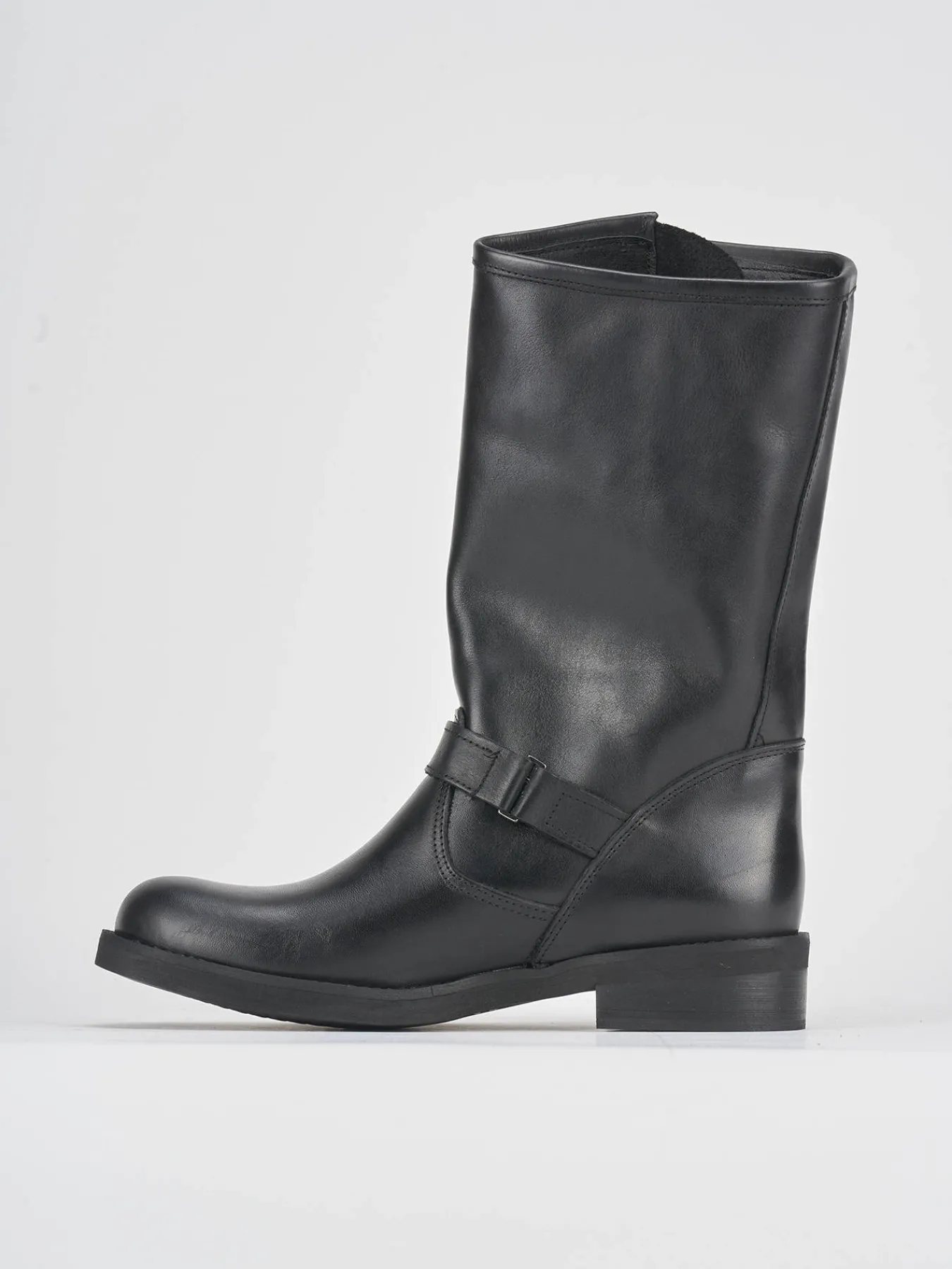Tronchetto tacco 3 cm fondo in gomma e soletto interno in vera pelle. Tomaia in morbida pelle, punta tonda, fibbia all’altezza della caviglia e in cima al gambale per un look cool. Altezza gambale a tre quarti polpaccio.