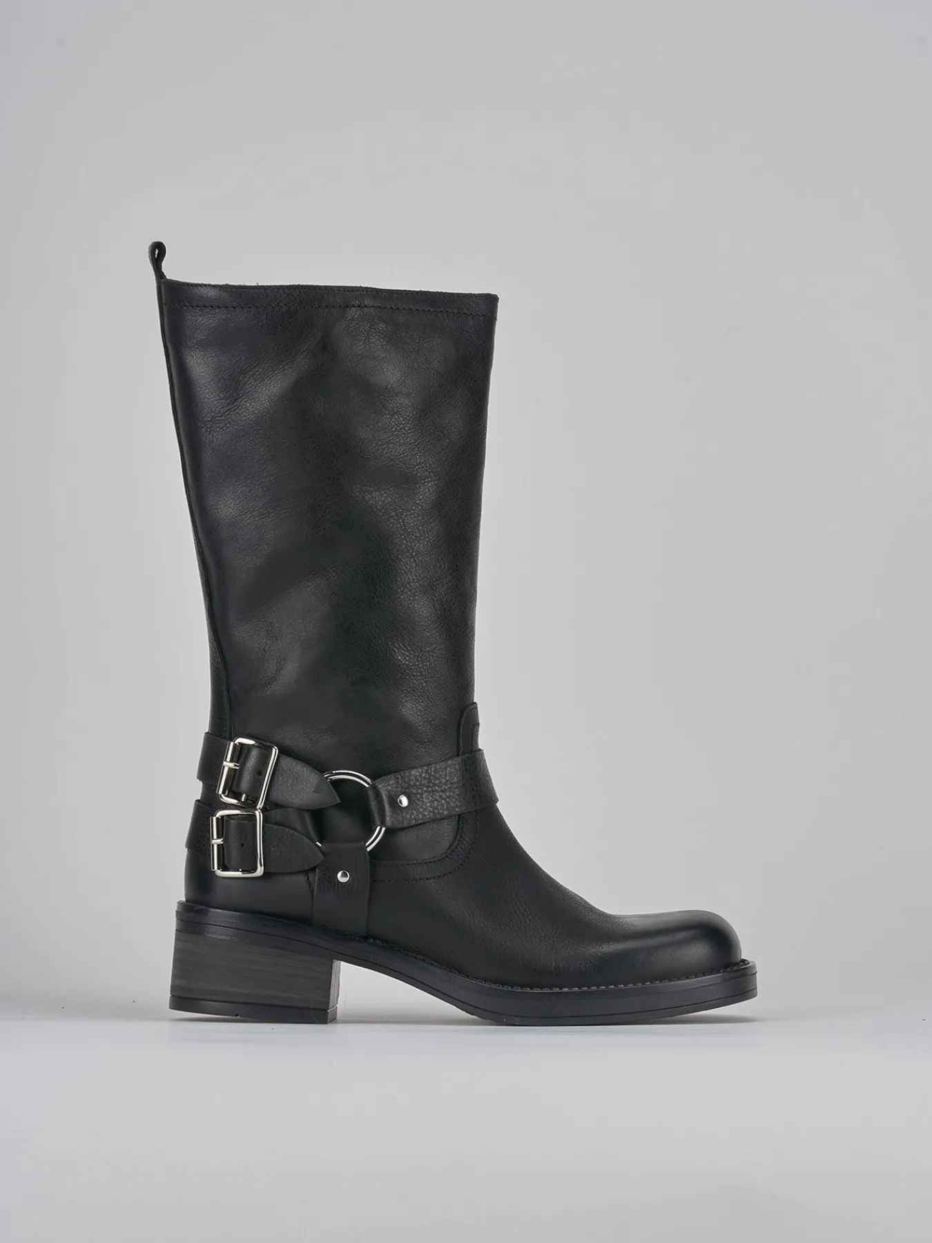 stivale biker tacco 5 cm fondo in gomma e soletto interno in vera pelle. tomaia in morbida pelle, punta squadrata, cuciture sulla tomaia, gambale tubolare a 3/4 con fibbia in caviglia. versatile sia con una gonna che dei jeans per un look biker perfetto.