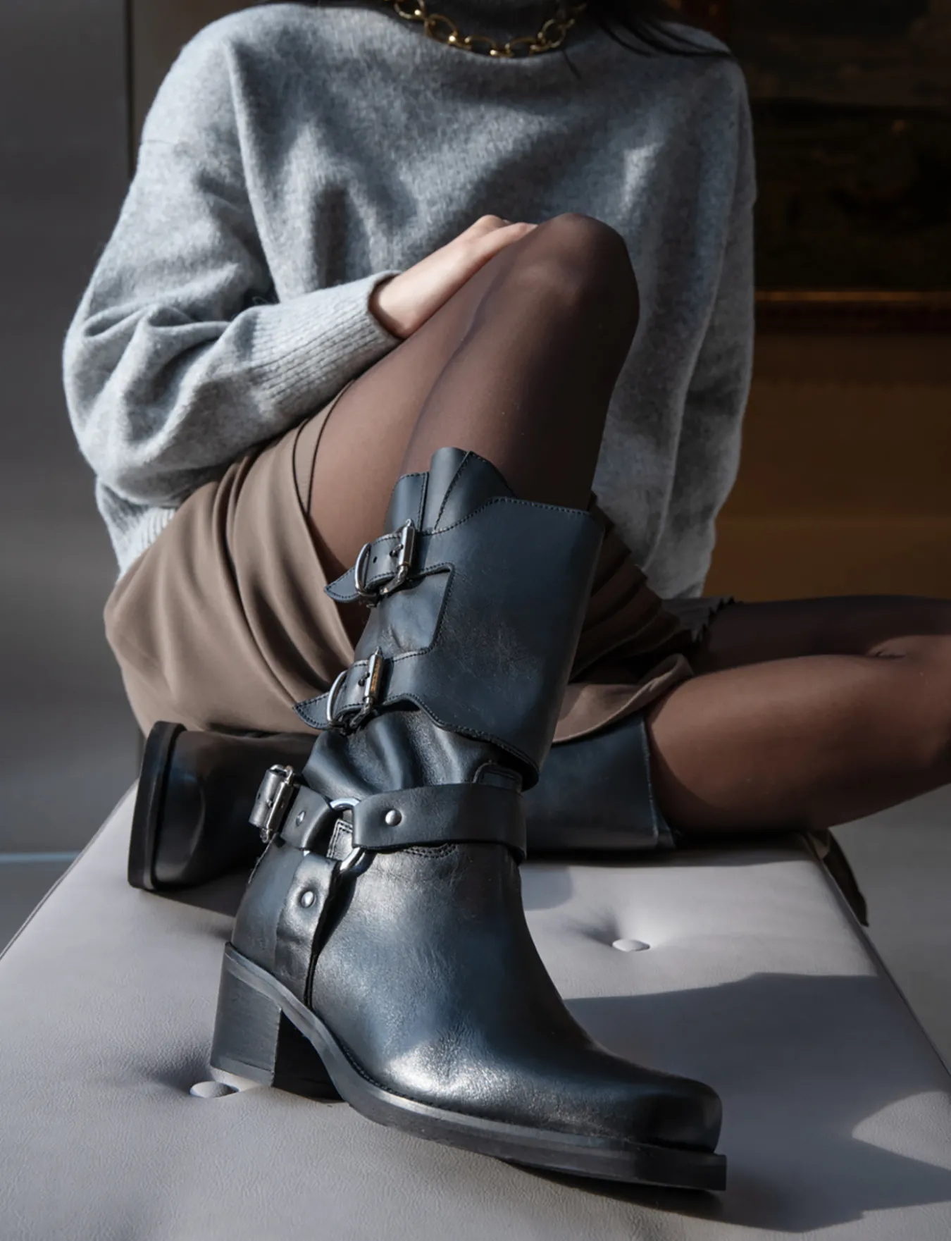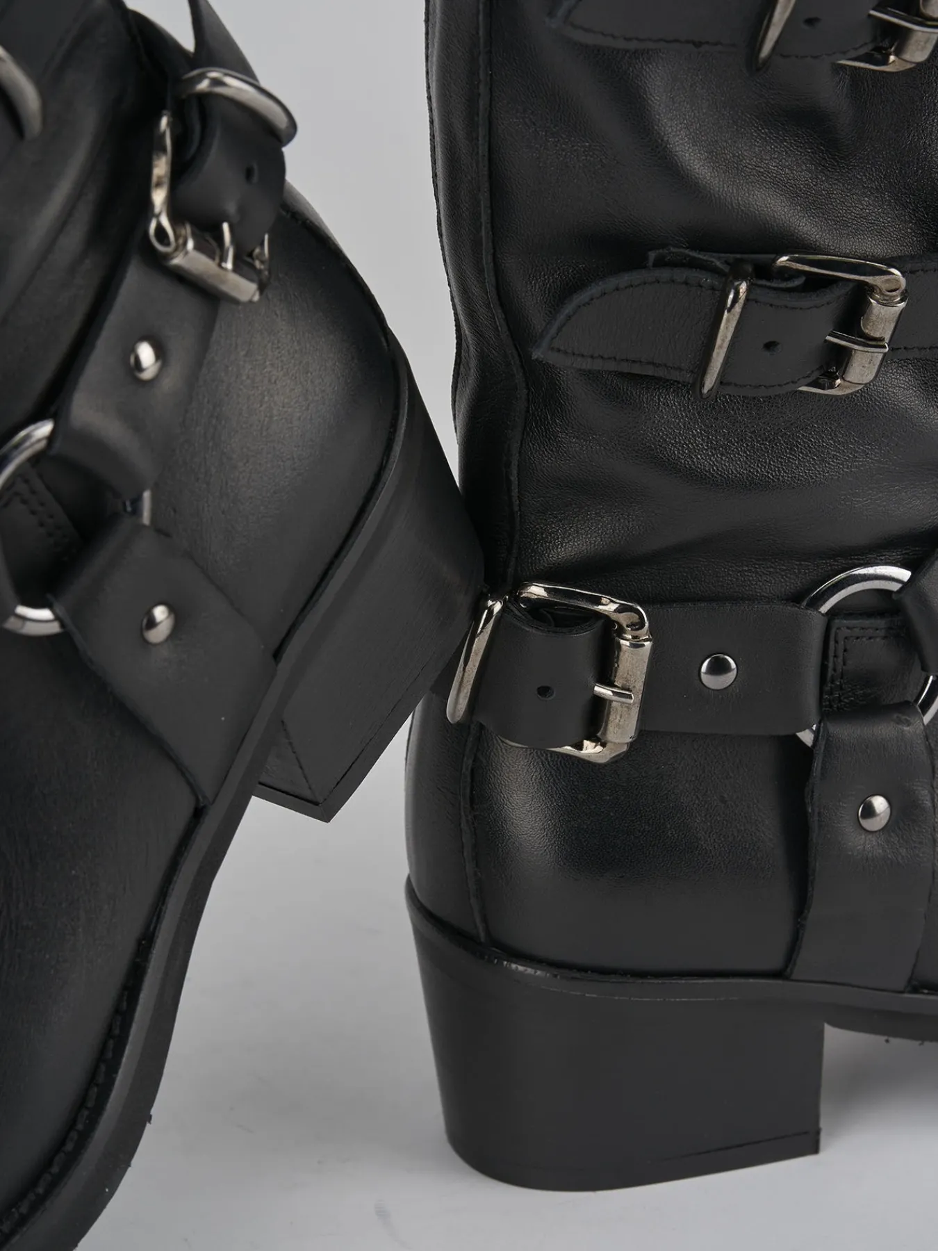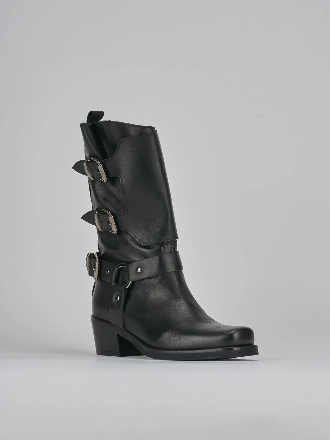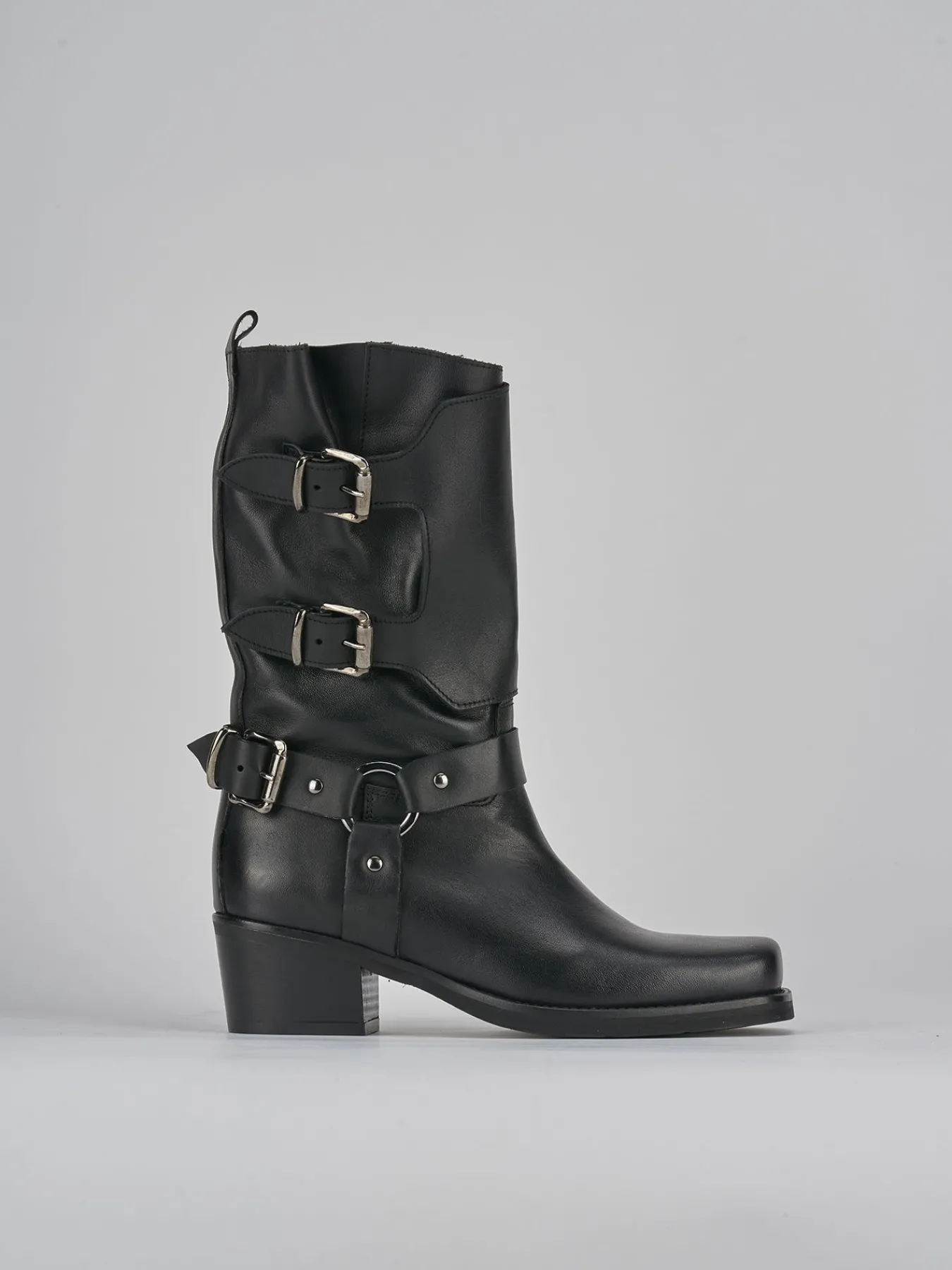 Stivale biker tacco 4 cm fondo in gomma e soletto interno in vera pelle. Tomaia in morbida pelle, punta leggermente squadrata, gambale con altezza a tre quarti polpaccio dotato di fascia aggiuntiva con dtacco solido e cerniera laterale per uno stile biker perfettamente adatto ai tuoi outfit.