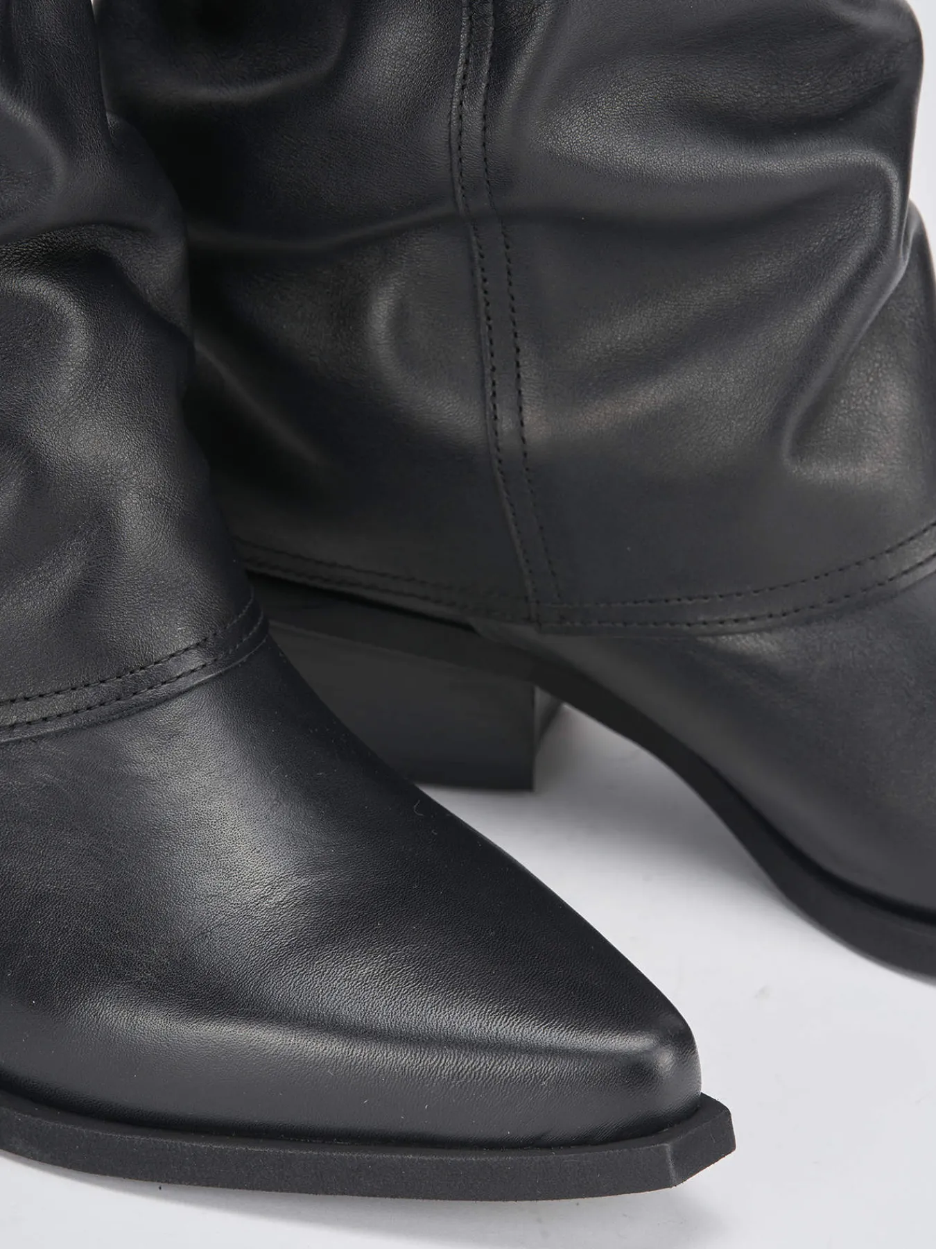 Stivale tacco 5 cm fondo in gomma e soletto interno in vera pelle. Tomaia in morbida pelle scamosciata, punta sfilata, cuciture ben visibili, ghette ai lati, stile texano e largo gambale che misura appena sotto il ginocchio per un look cool.