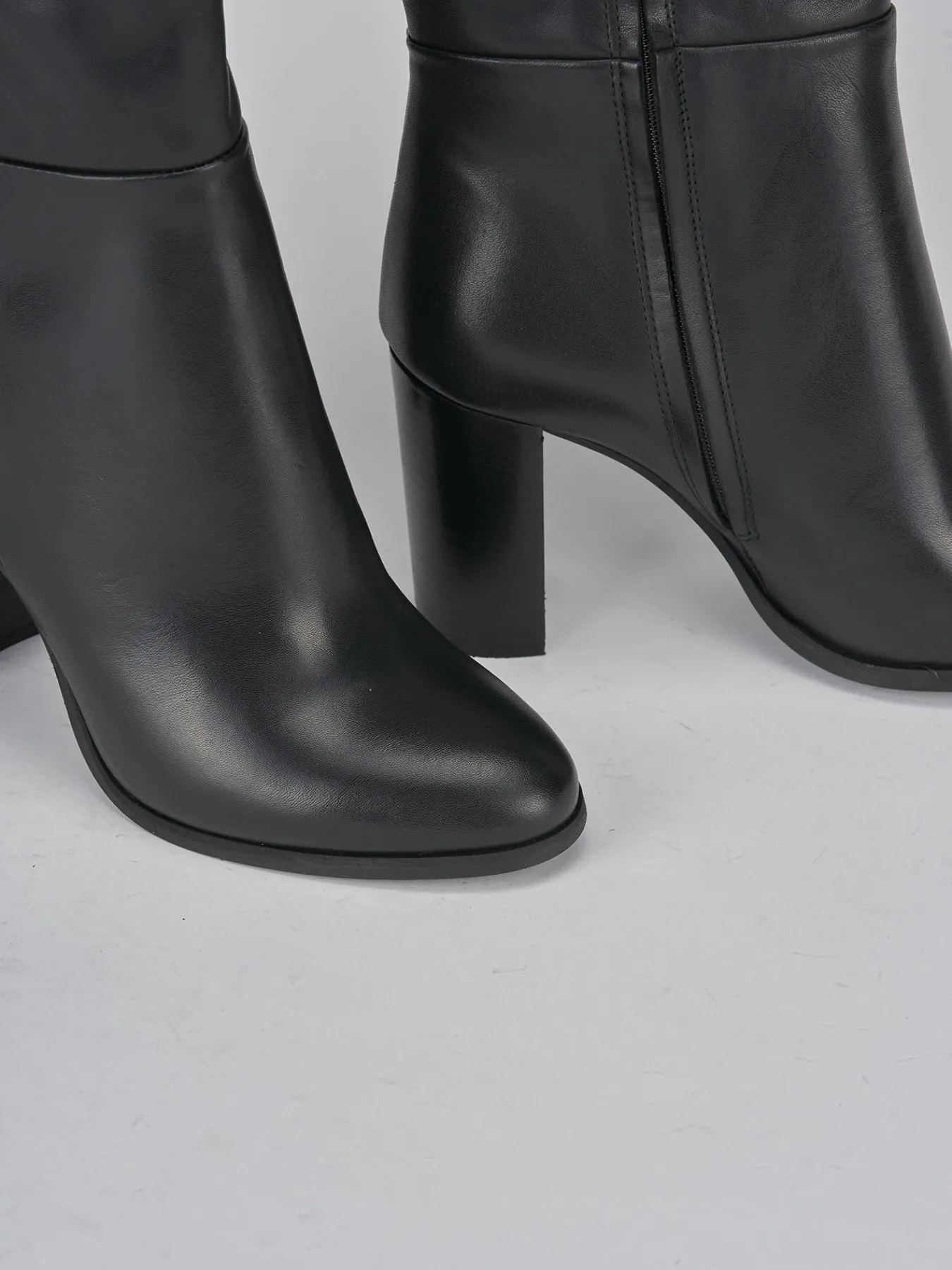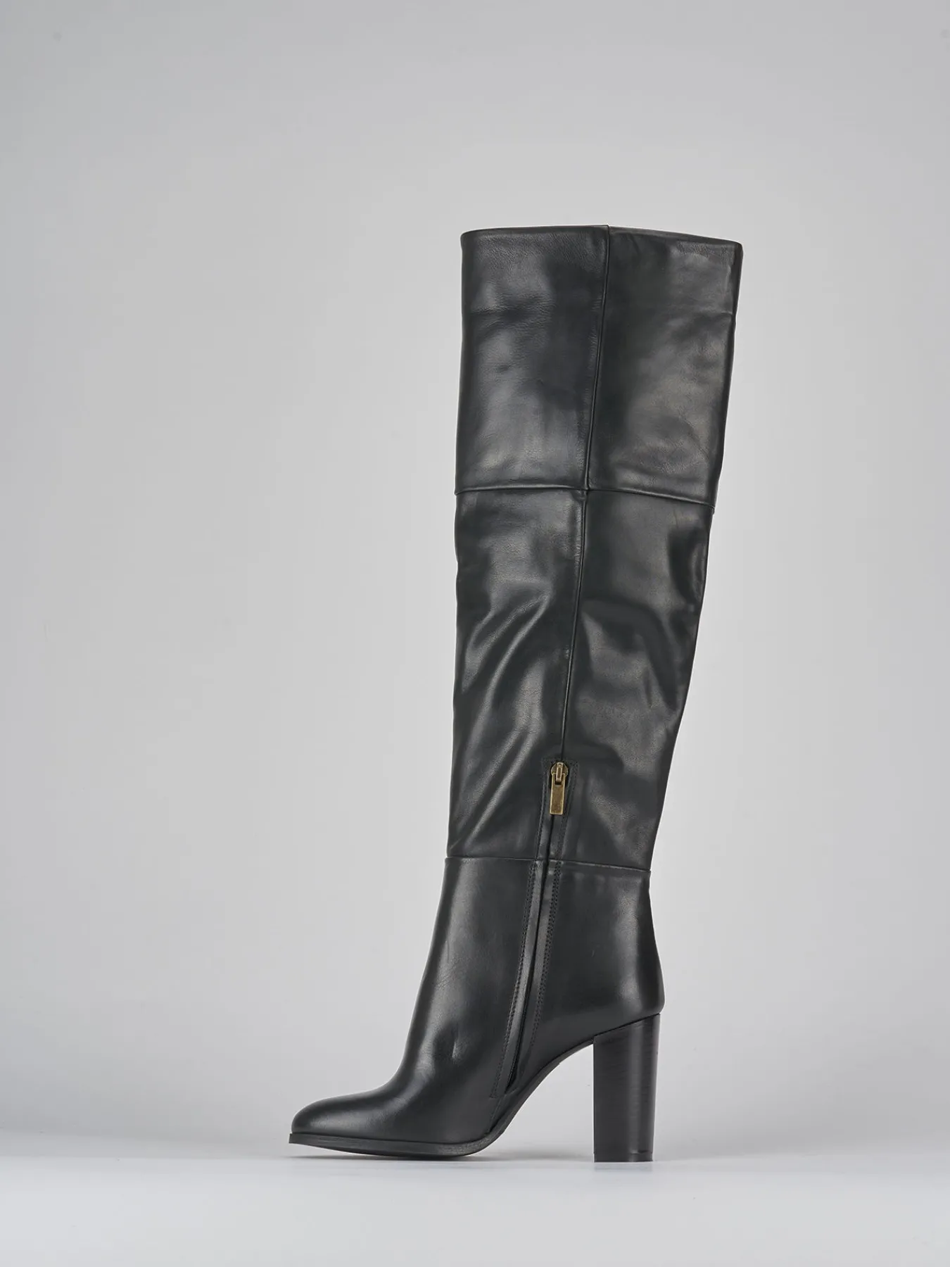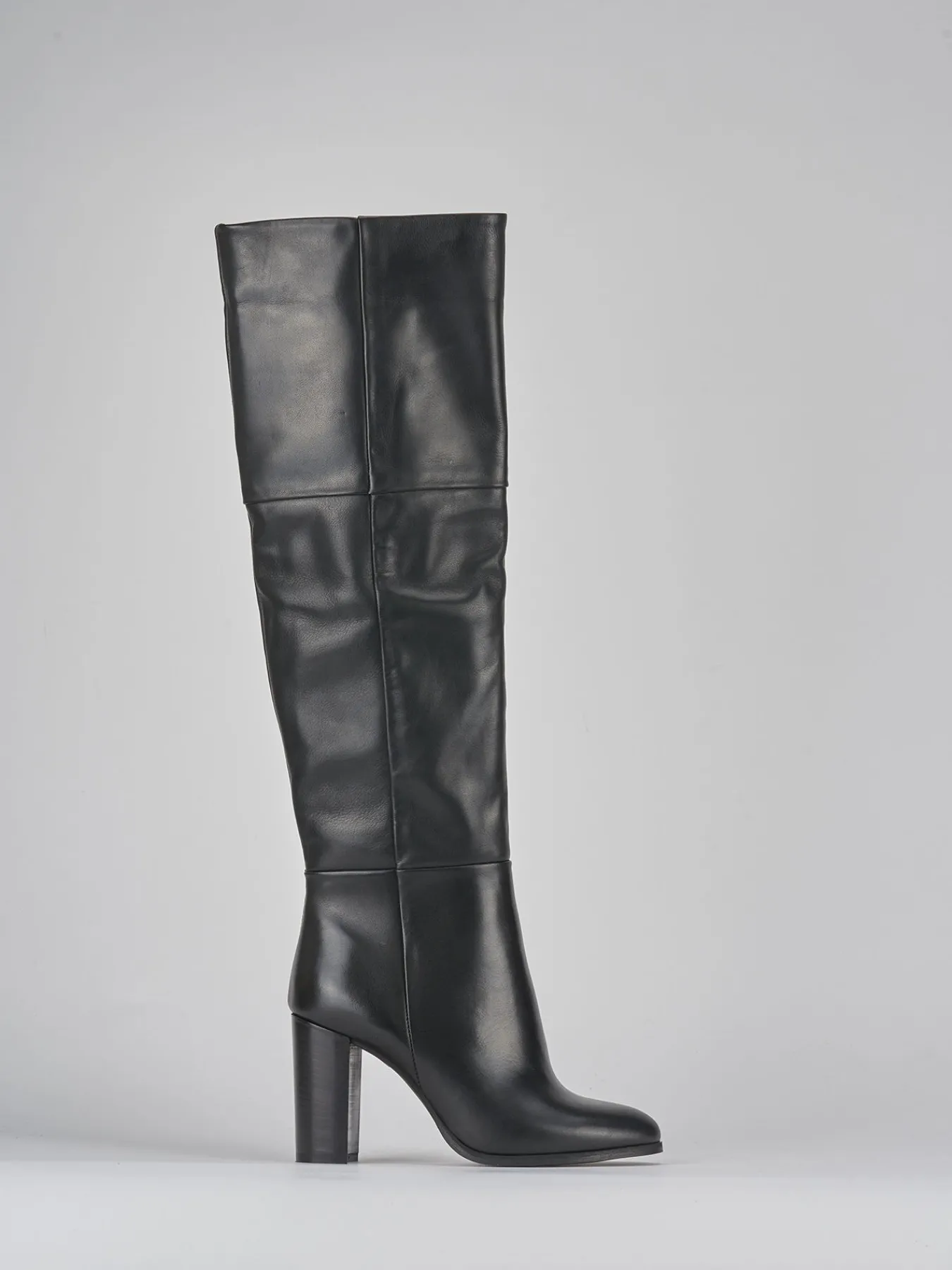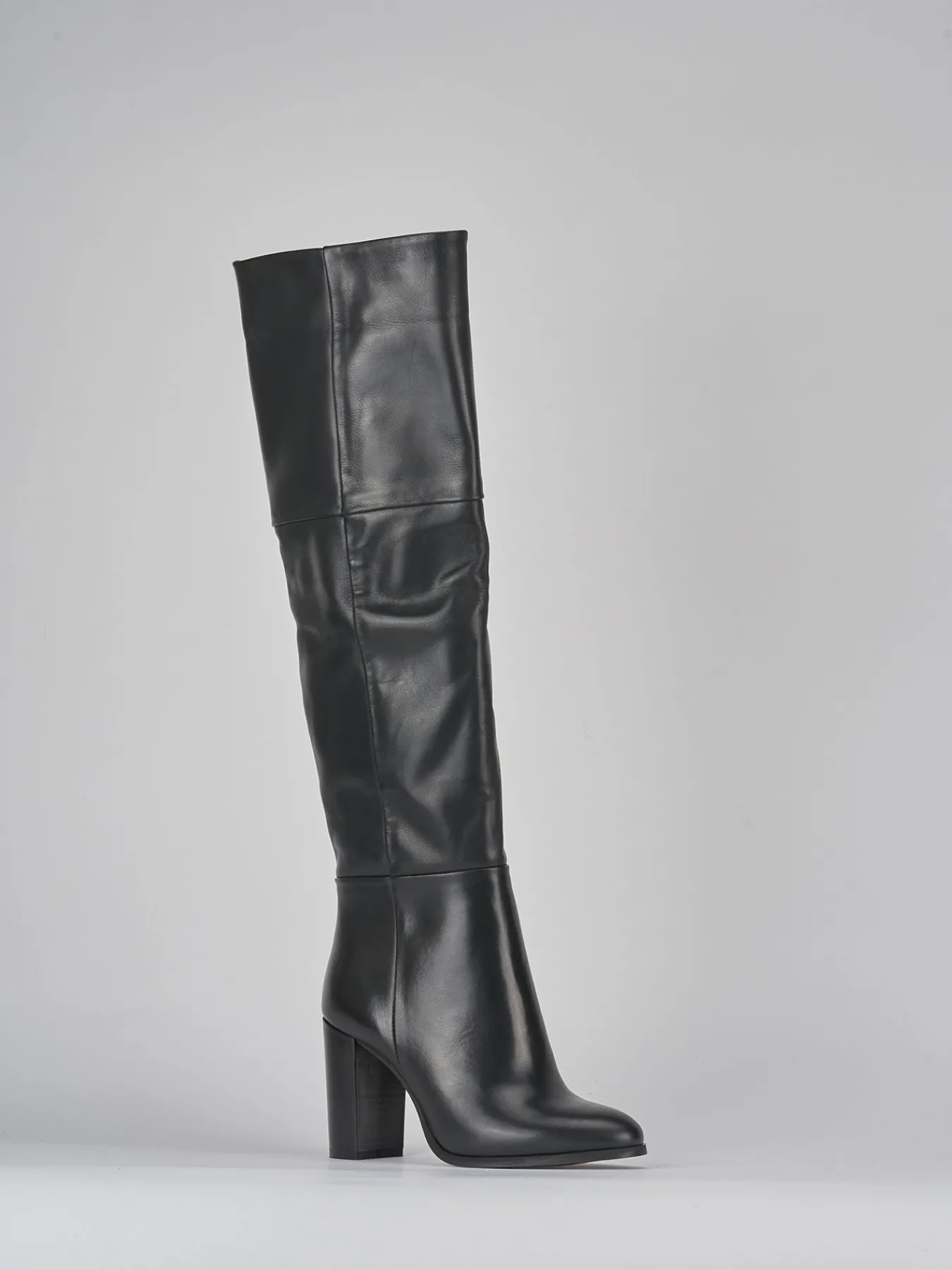 Stivale tacco 8 cm fondo in gomma e soletto interno in vera pelle. Tomaia in morbida pelle, punta affusolata, cuciture visibili, cerniera laterale interna, gambale tubolare che misura appena sopra il ginocchio. particolare cucitura come risvolto sulla parte alta del gambale e tacco grosso per un look chic.