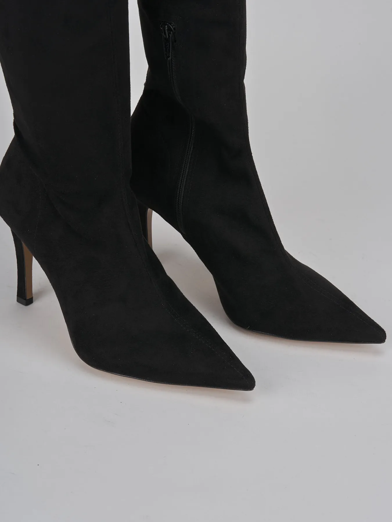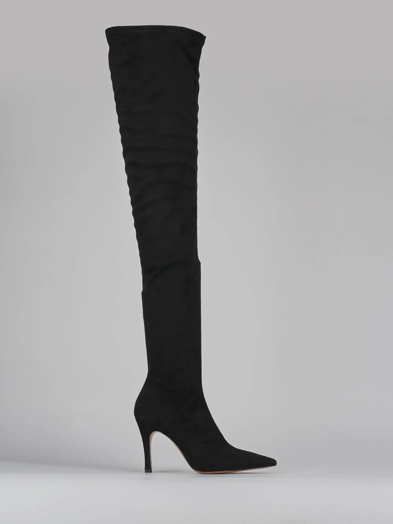 Stivale tacco 9 cm fondo in leggera gomma e soletto interno in vera pelle. tomaia in morbido camoscio elasticizzato, punta sfilata, cerniera laterale, gambale liscio ed elasticizzato perfetto per aderire alla forma della gamba, tacco fino per un look cool.