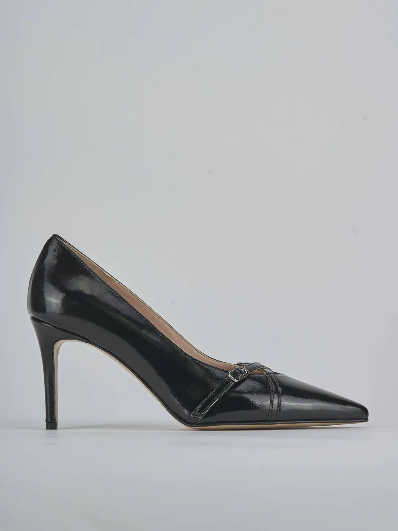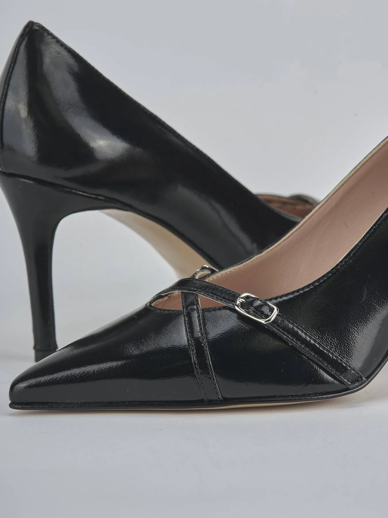Decolte’ tacco 7 cm fondo in cuoio e soletto interno in vera pelle. Tomaiain morbida pelle effetto verniciato, punta sfilata, scollo stretto a ‘U’, due cinturini con fibbia regolabile incrociati sul collo del piede e tacco fino. Dal design ricercato per durare nel tempo.