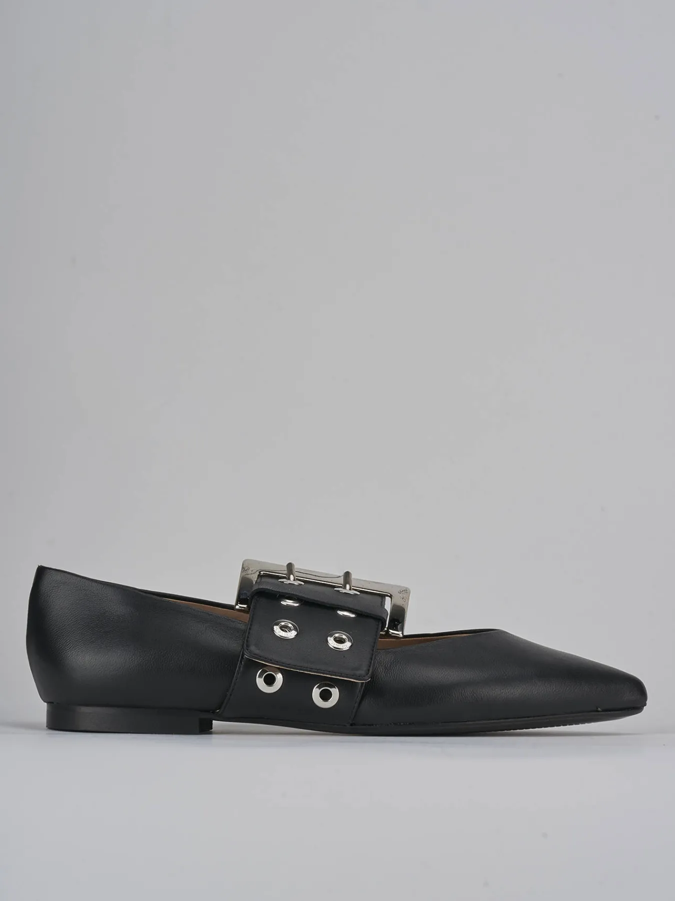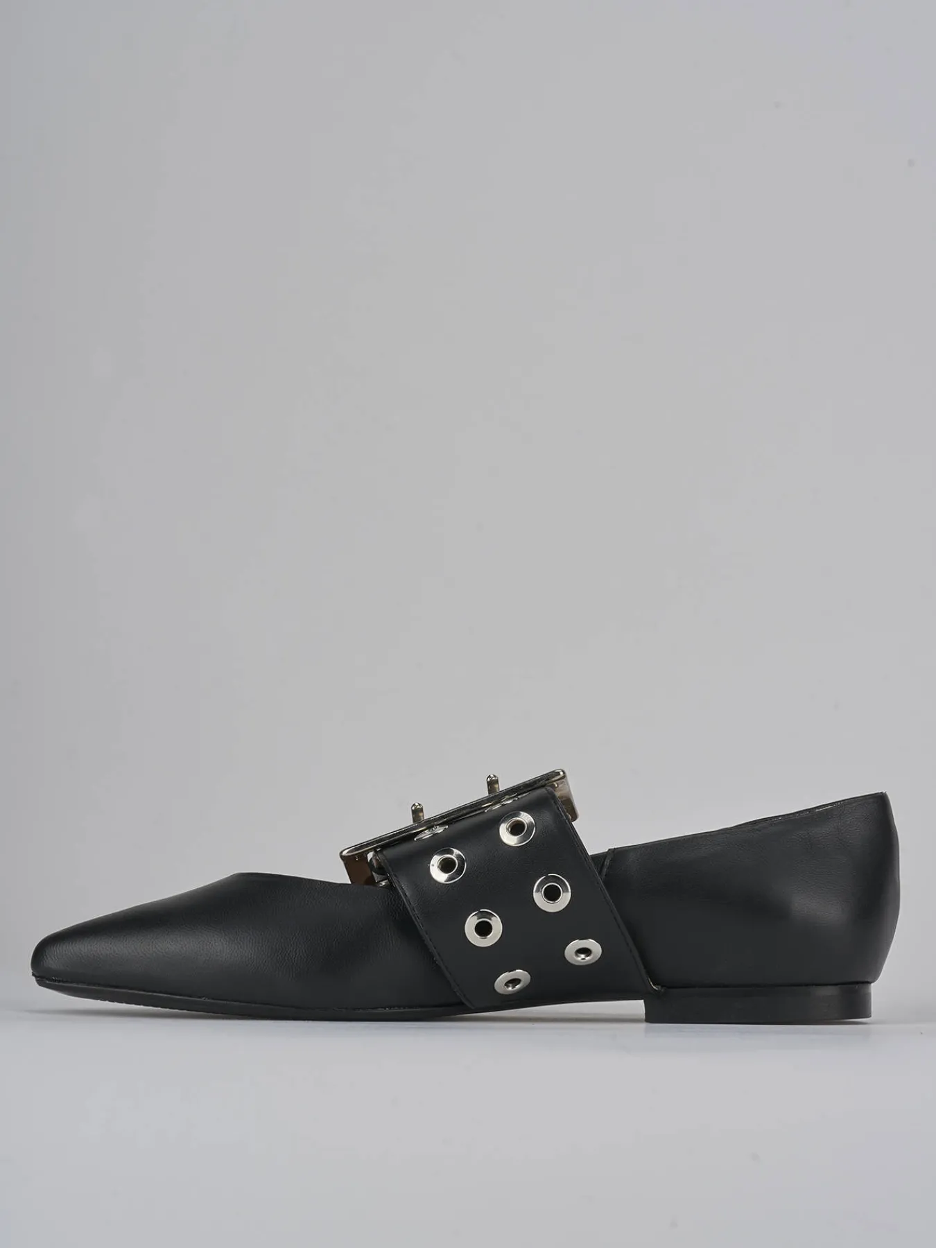 La punta sfilata e lo scollo a ‘V’ aggiungono un tocco di raffinatezza, mentre il cinturino spesso con fibbia regolabile e le borchie creano un look audace e moderno.