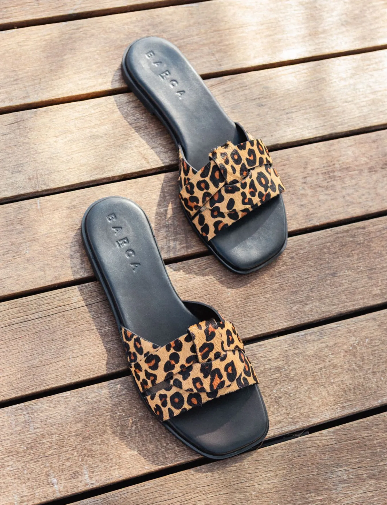 Realizzate con una tomaia in morbida pelle ricoperta di cavallino stampato leopardo, queste ciabatte offrono uno stile unico e alla moda.
