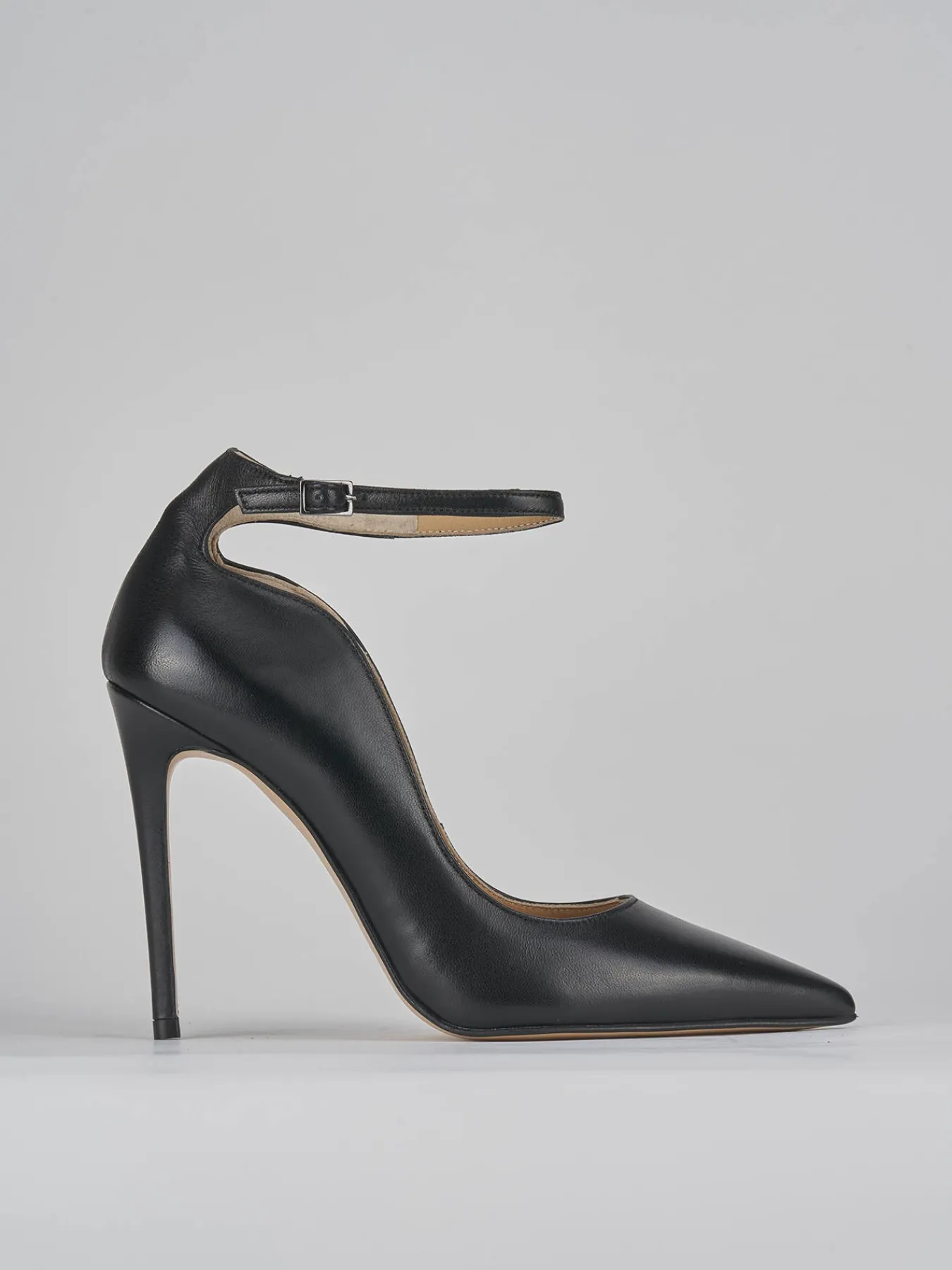 Bebè tacco 11 cm fondo in cuoio e soletto interno in vera pelle. Tomaia in morbida pelle nappata, punta sfilata, bordi esterni svasati, cinturino con fibbia regolabile in caviglia e tacco fino per un look chic.