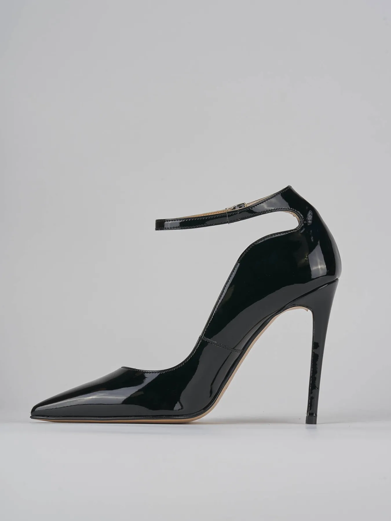 Bebè tacco 11 cm fondo in cuoio e soletto interno in vera pelle. Tomaia in morbida pelle effetto verniciato, punta sfilata, apertura svasata in punta, cinturino regolabile in caviglia. eleganti bordi morbidi e svasati per dare un tocco chic ai tuoi outfit.