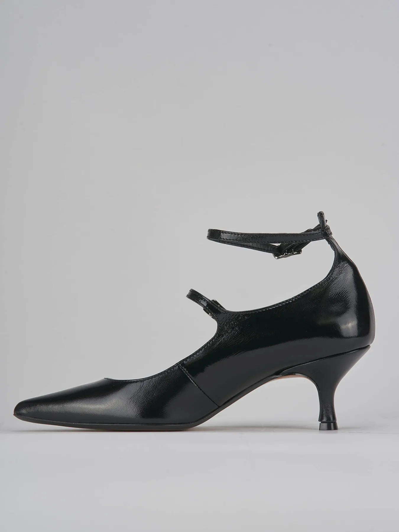 Bebè tacco 5 cm fondo in gomma e soletto interno in vera pelle. Tomaia in morbida pelle effetto verniciato, punta sfilata, doppio cinturino regolabile e comodo tacco rocchetto. perfetto con una gonna di jeans e un maglione.