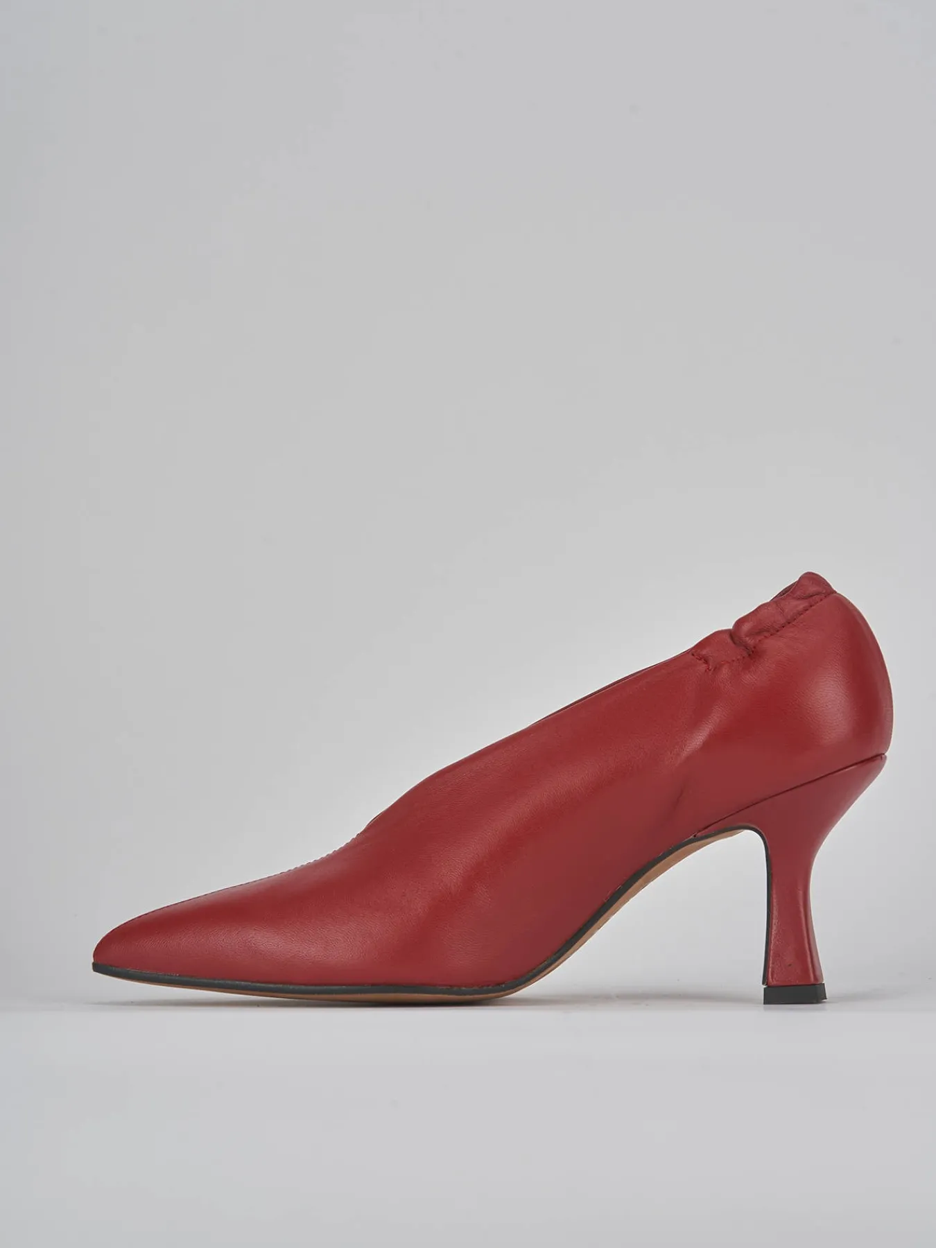 Decoltè tacco 7 cm fondo in cuoio e soletto interno in vera pelle. Tomaia in morbida pelle nappata, punta sfilata, apertura a ‘V’ che si stringe sul collo del piede e comodo tallone morbido per un fit su misura. Tacco a rocchetto per un look che unisce comodità ad eleganza.