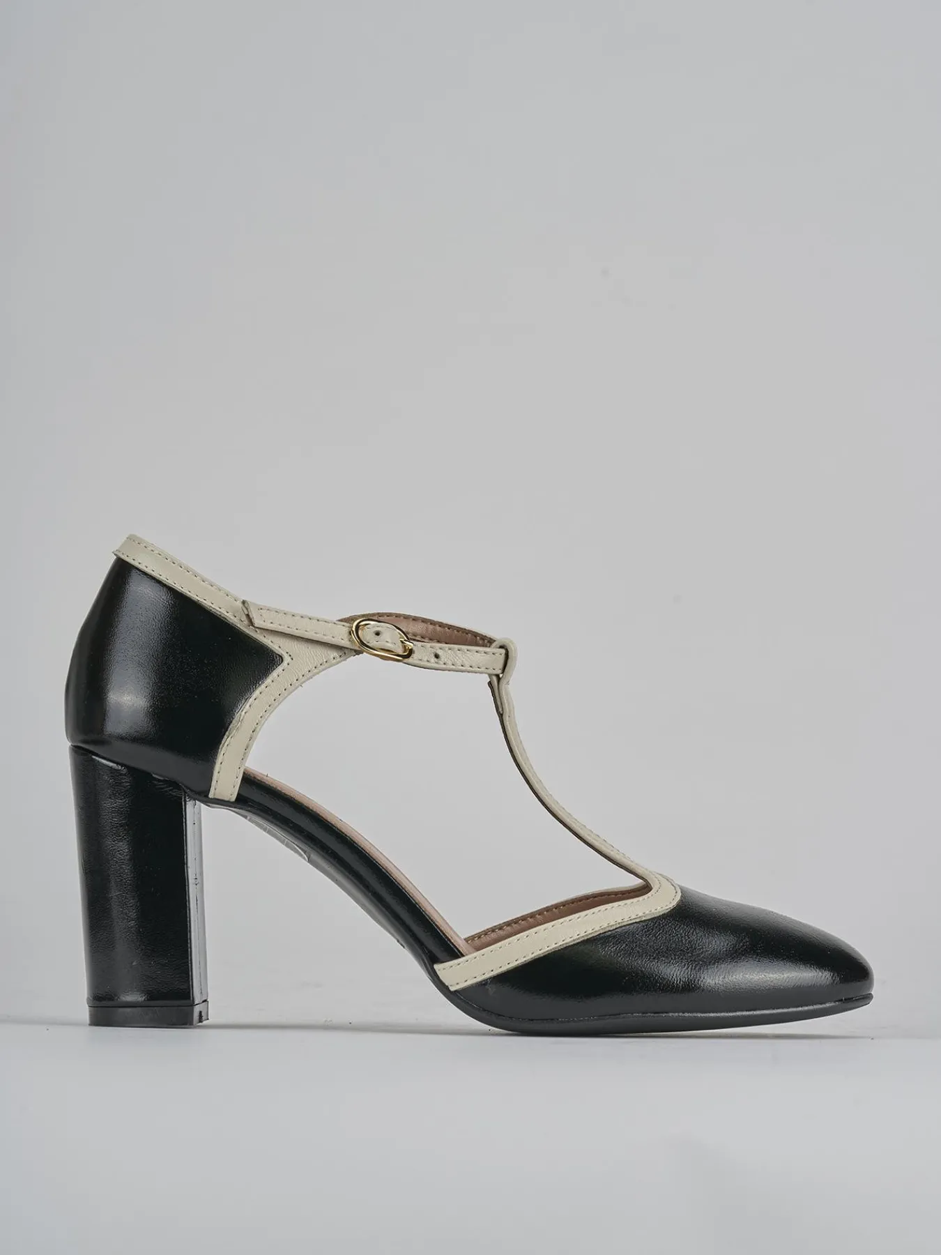 Il tacco grosso garantisce stabilità, mentre il fondo in leggerissima gomma e il soletto interno in vera pelle assicurano comfort per tutto il giorno.
