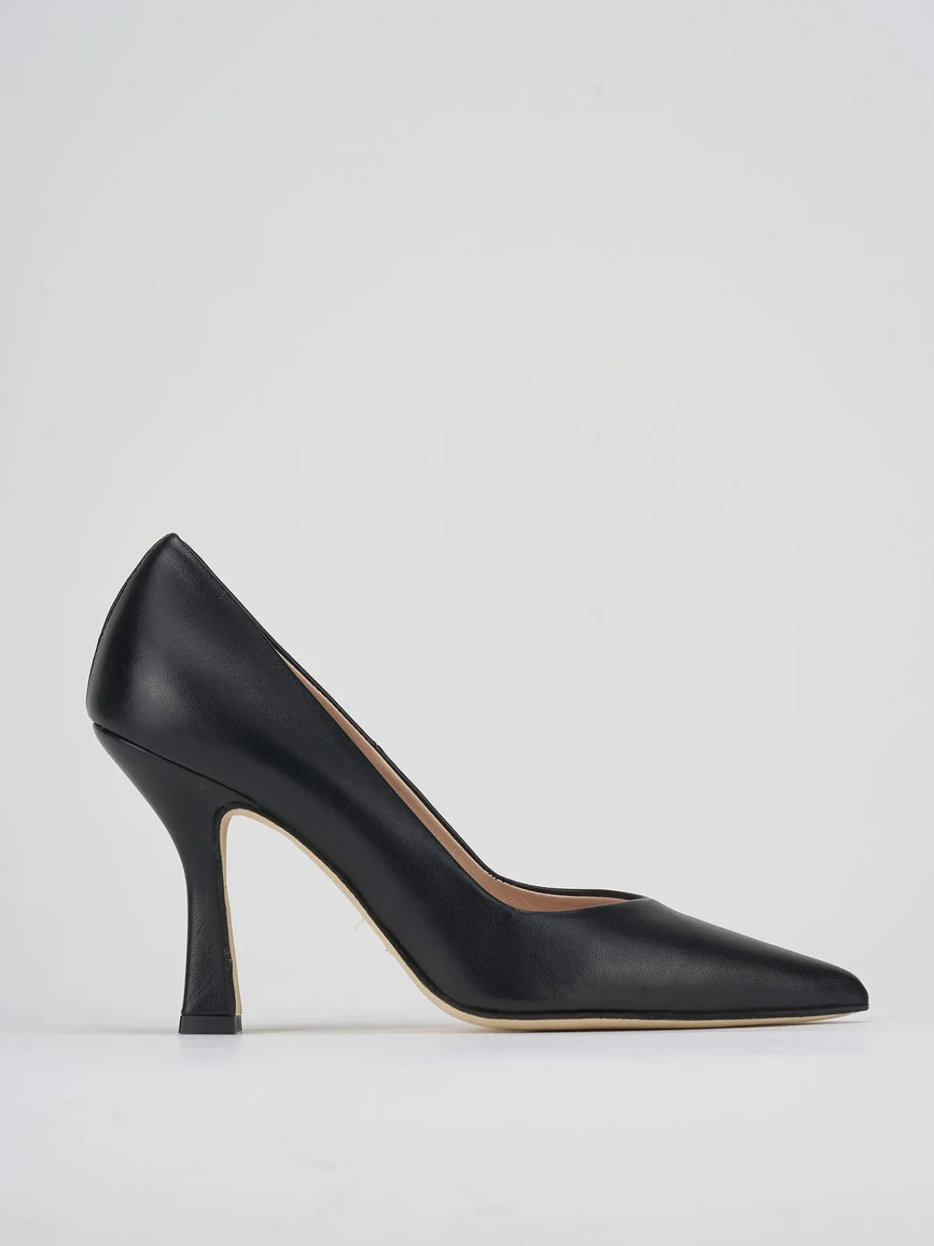 Decoltè tacco 9 cm, fondo in cuoio soletto interno in vera pelle. Tomaia in pelle nappata, punta sfilata, scollo a v, tacco fino, adatte con una gonna o un vestito per un look semplice ed elegante.