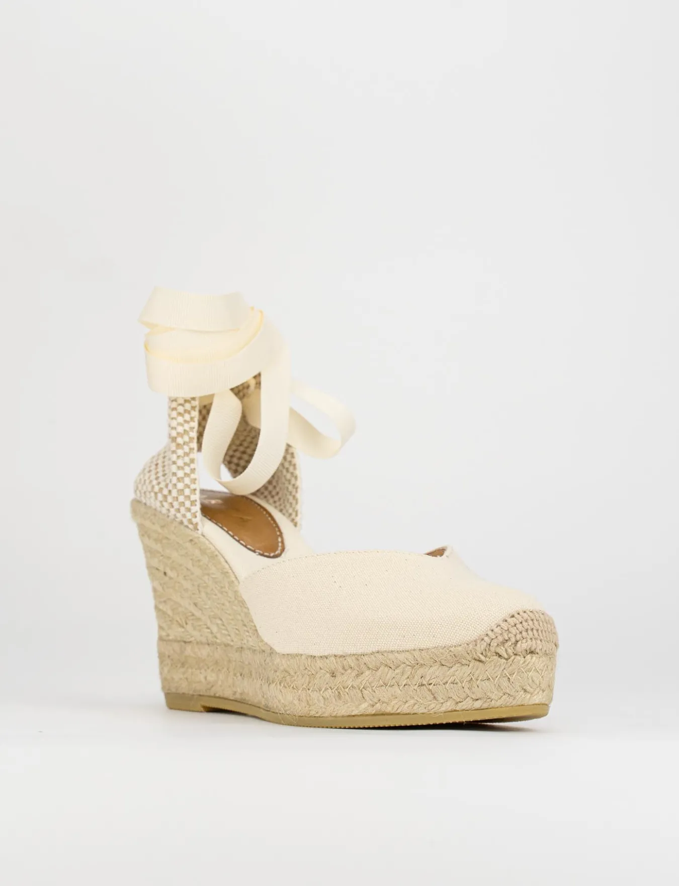 Espadrilla zeppa 9 cm, fondo gomma e soletto interno in vera pelle. tomaia in morbido tessuto, punta chiusa, tallone scoperto e laccetto per un look perfetto per l’estate.
