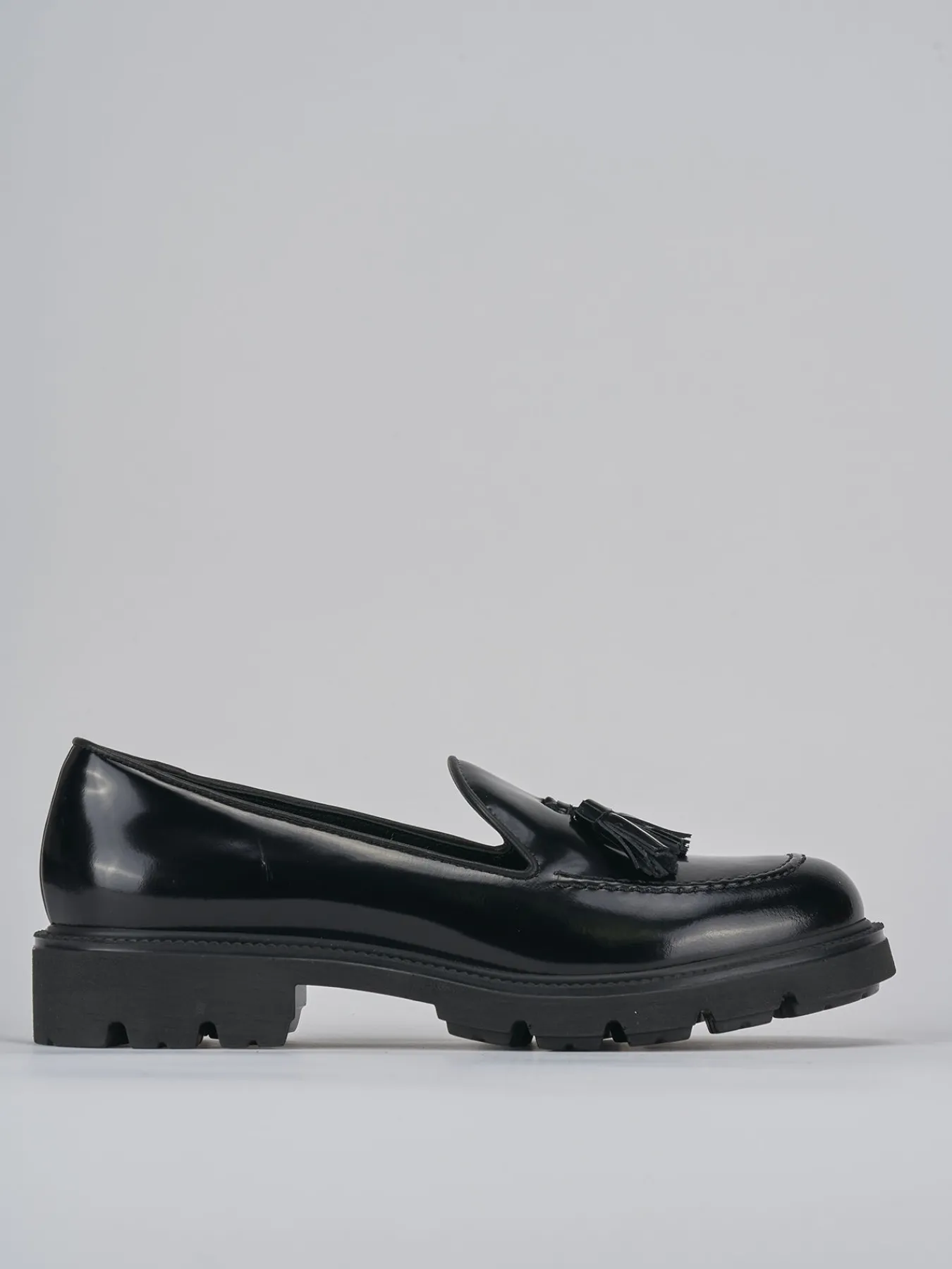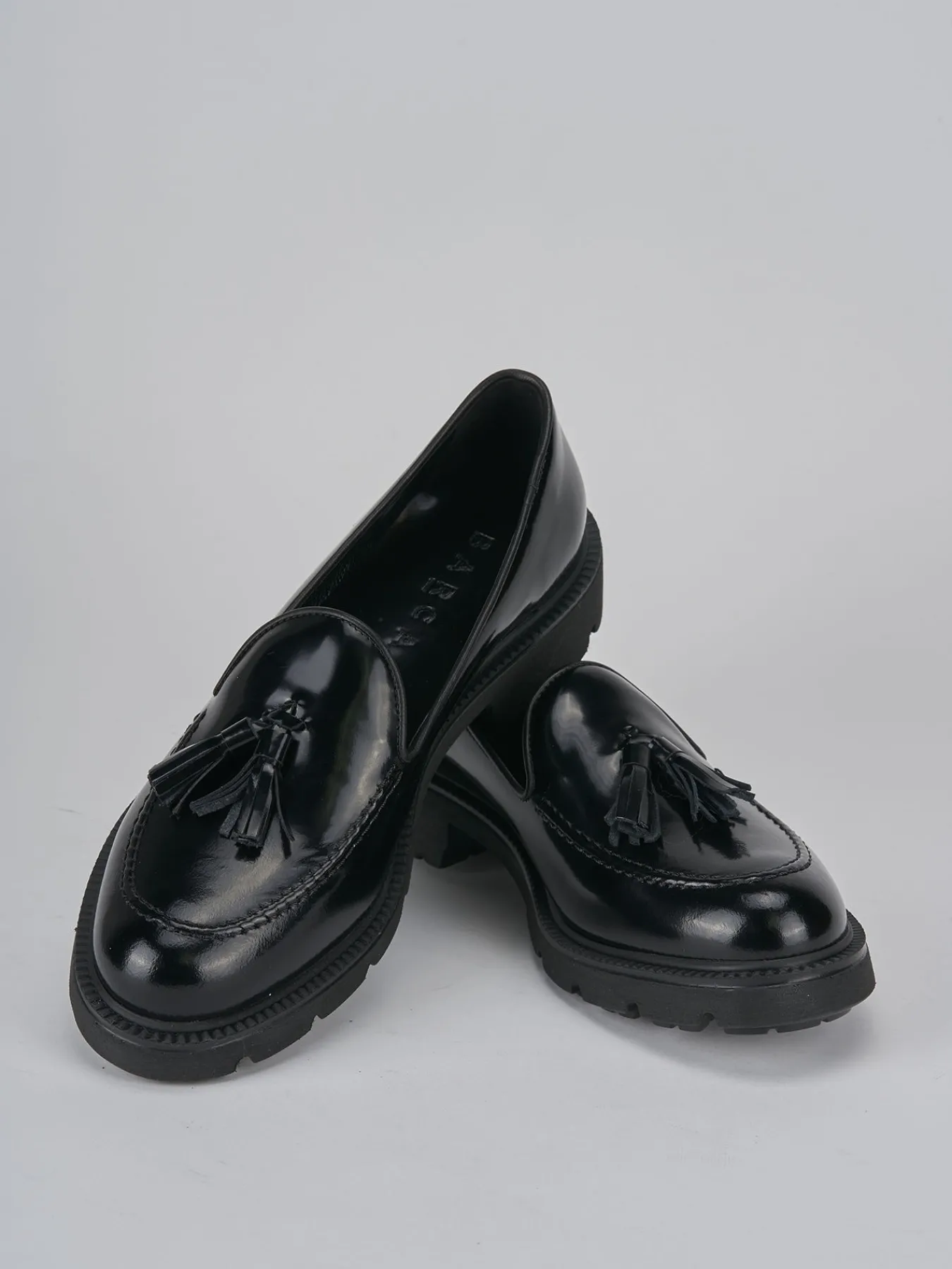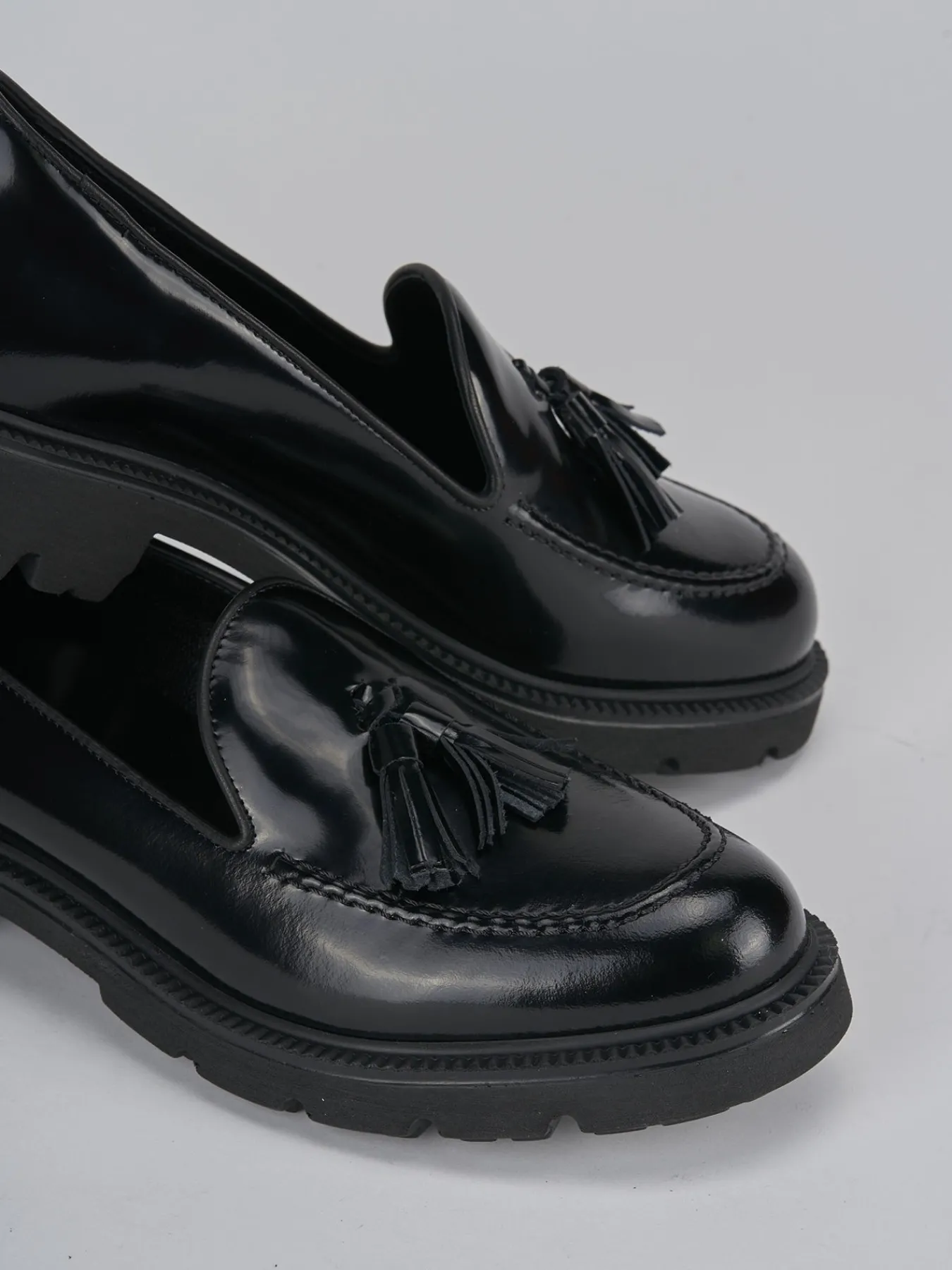 Mocassino tacco 2 cm fondo in gomma e soletto interno in vera pelle. Tomaia in morbida pelle spazzolata effetto lucido, punta leggermente squadrata, cuciture visibili e nappine per un look classico e ad effetto.