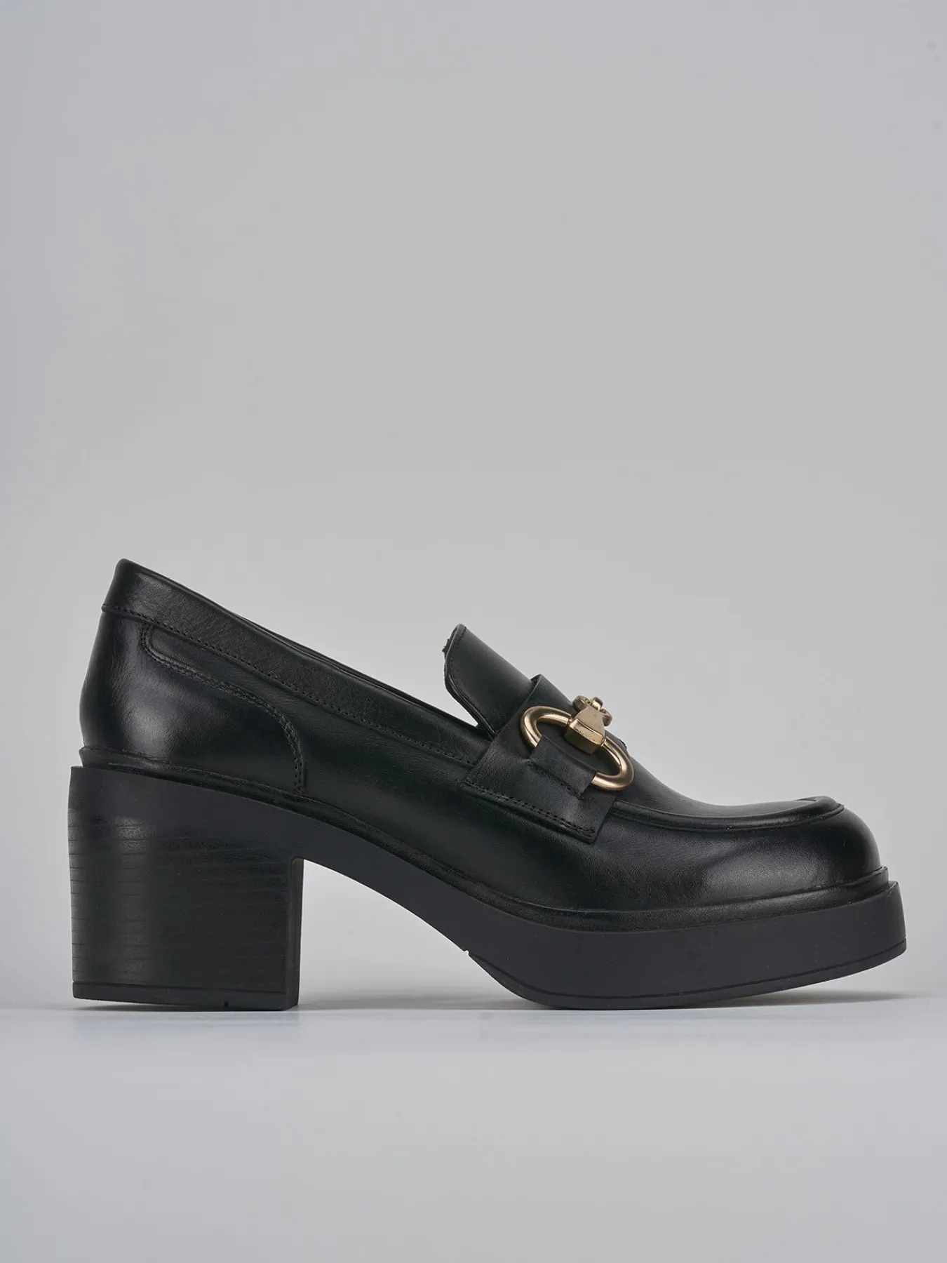 Mocassino tacco 5 cm fondo in gomma e soletto interno in vera pelle. tomaia in morbida pelle, punta leggermente squadrata, cuciture a vista, morsetto. tacco grosso e plateau di 2 cm sulla parte anteriore del mocassino per un look chic.