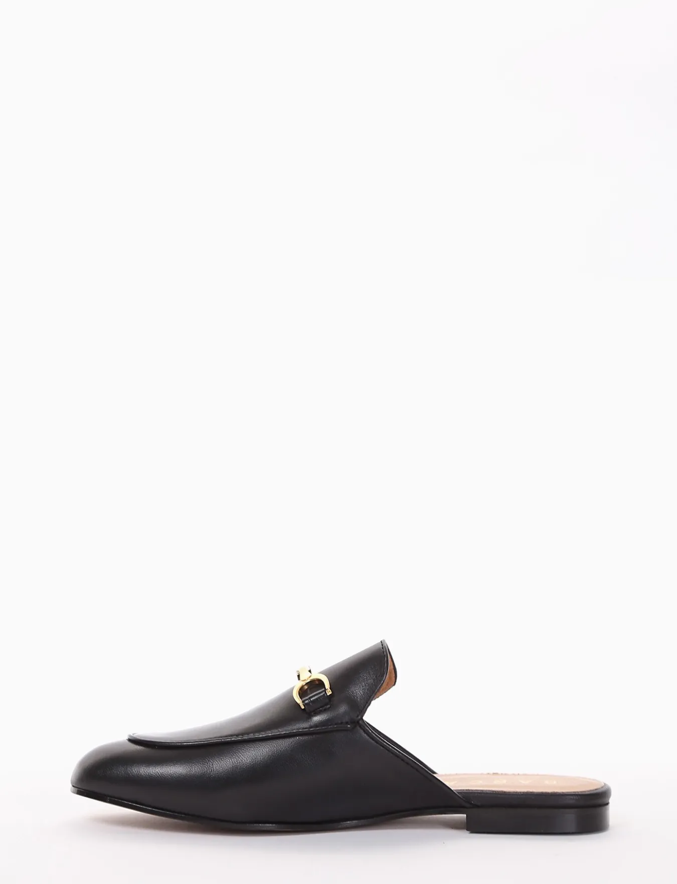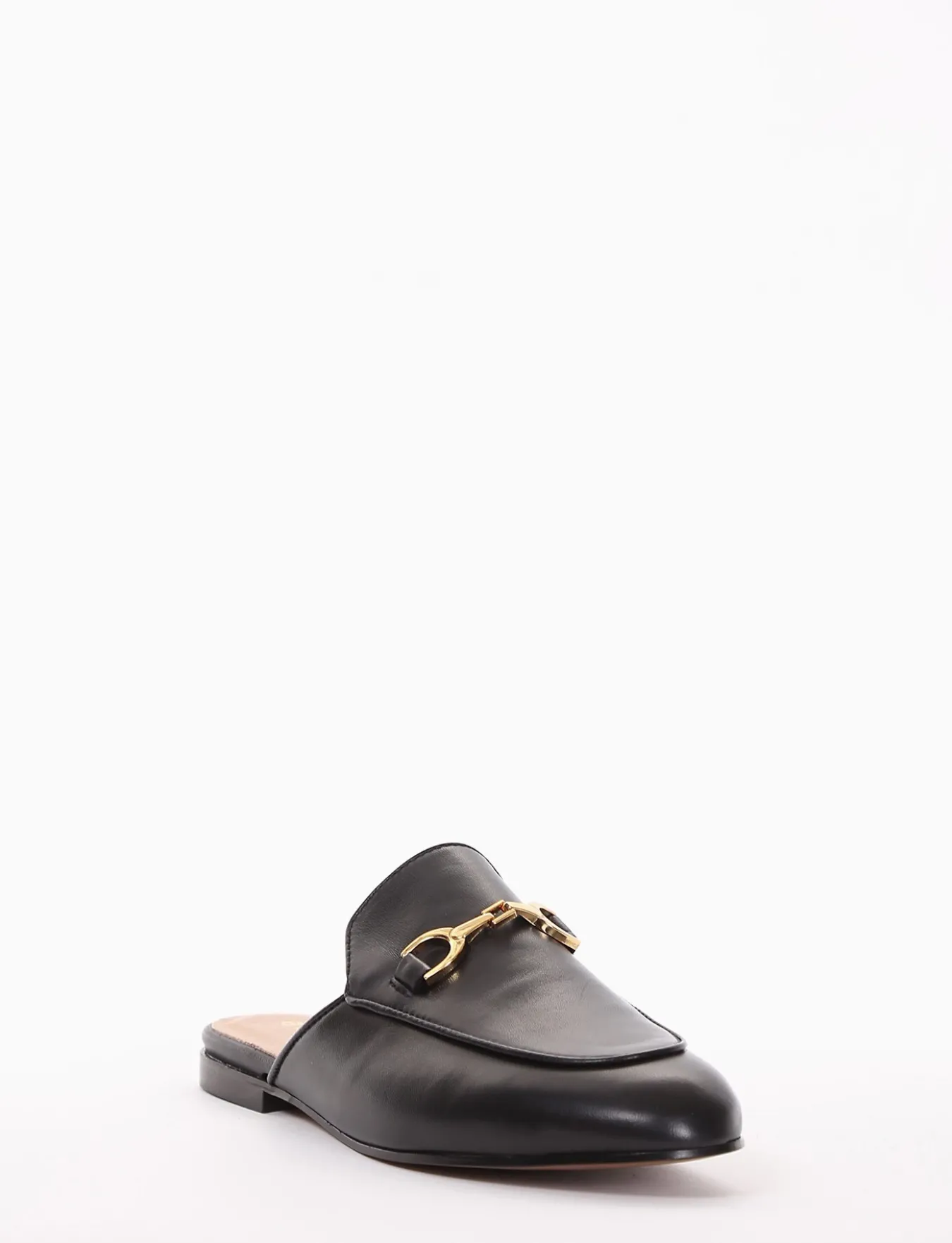 sabot tacco 1 cm, fondo in cuoio e soletto interno in vera pelle. Tomaia in morbidissima pelle nappata. Particolarissimo morsetto in metallo dorato sul collo del piede.
