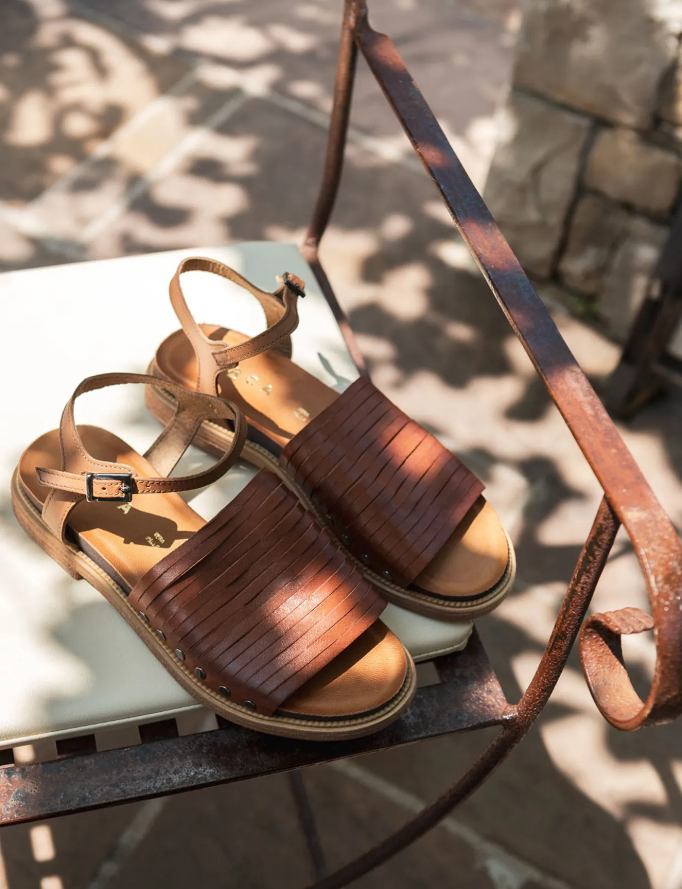 Realizzati in pregiata pelle marrone, questi sandali presentano una tomaia morbida con un design a fascia ampia, arricchita da fasce finemente laserate.
