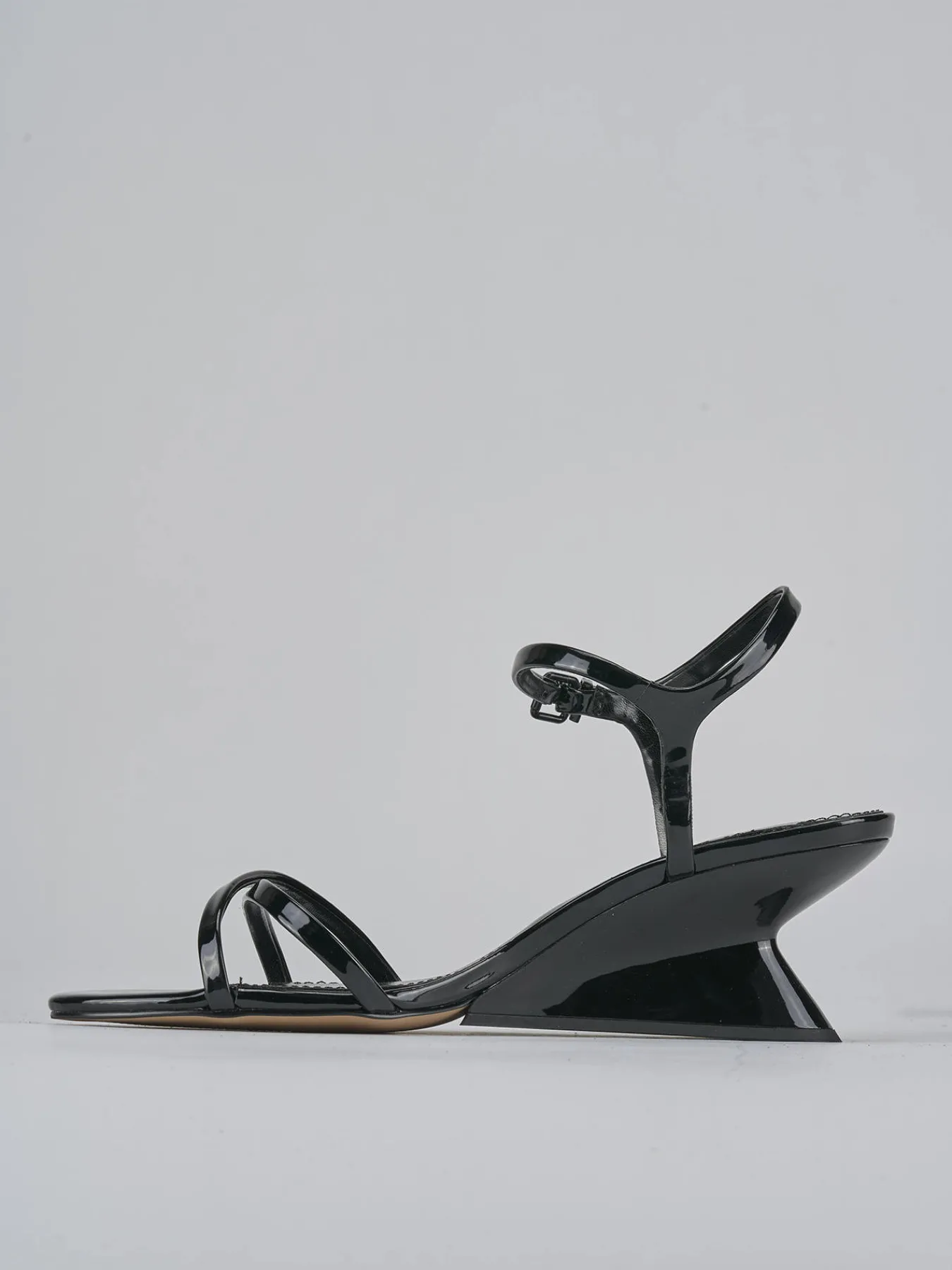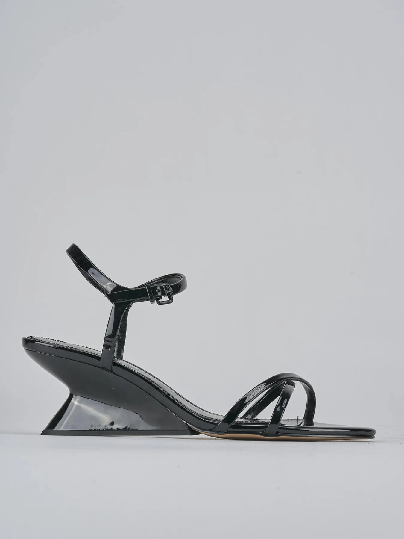 Sandalo tacco 5 cm fondo in leggerissima gomma e soletto interno in vera pelle. tomaia in morbida pelle, punta affusolata, due fasce incrociate, cinturino in caviglia con fibbia regolabile. Nuovissimo tacco geometrico in ABS per un look super cool.