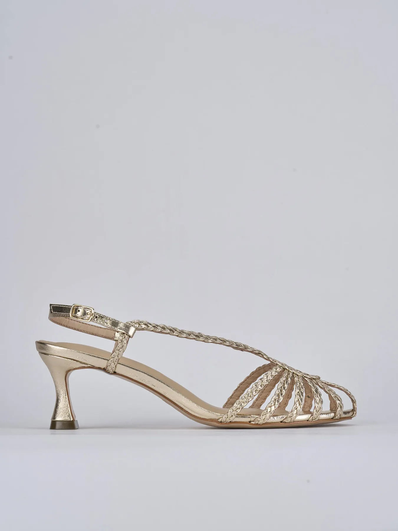 Sandalo tacco 5 cm fondo in leggerissima gomma e soletto interno in vera pelle. tomaia in morbida pelle, punta affusolata, fasce con intreccio e incrociate sulla punta a cestino, cinturino regolabile e tacco rocchetto. perfetto per questa stagione!
