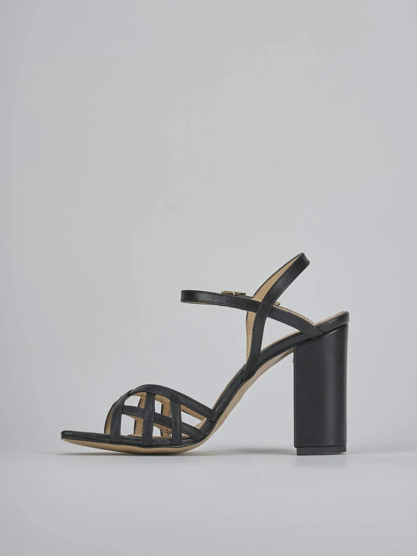 Sandalo tacco 9 cm fondo in leggera gomma e soletto interno in vera pelle. Tomaia in morbida pelle, punta squadrata, fascette a ragnetto, cinturino con fibbia regolabile e tacco grosso. Perfetto per le tue occasioni più speciali.