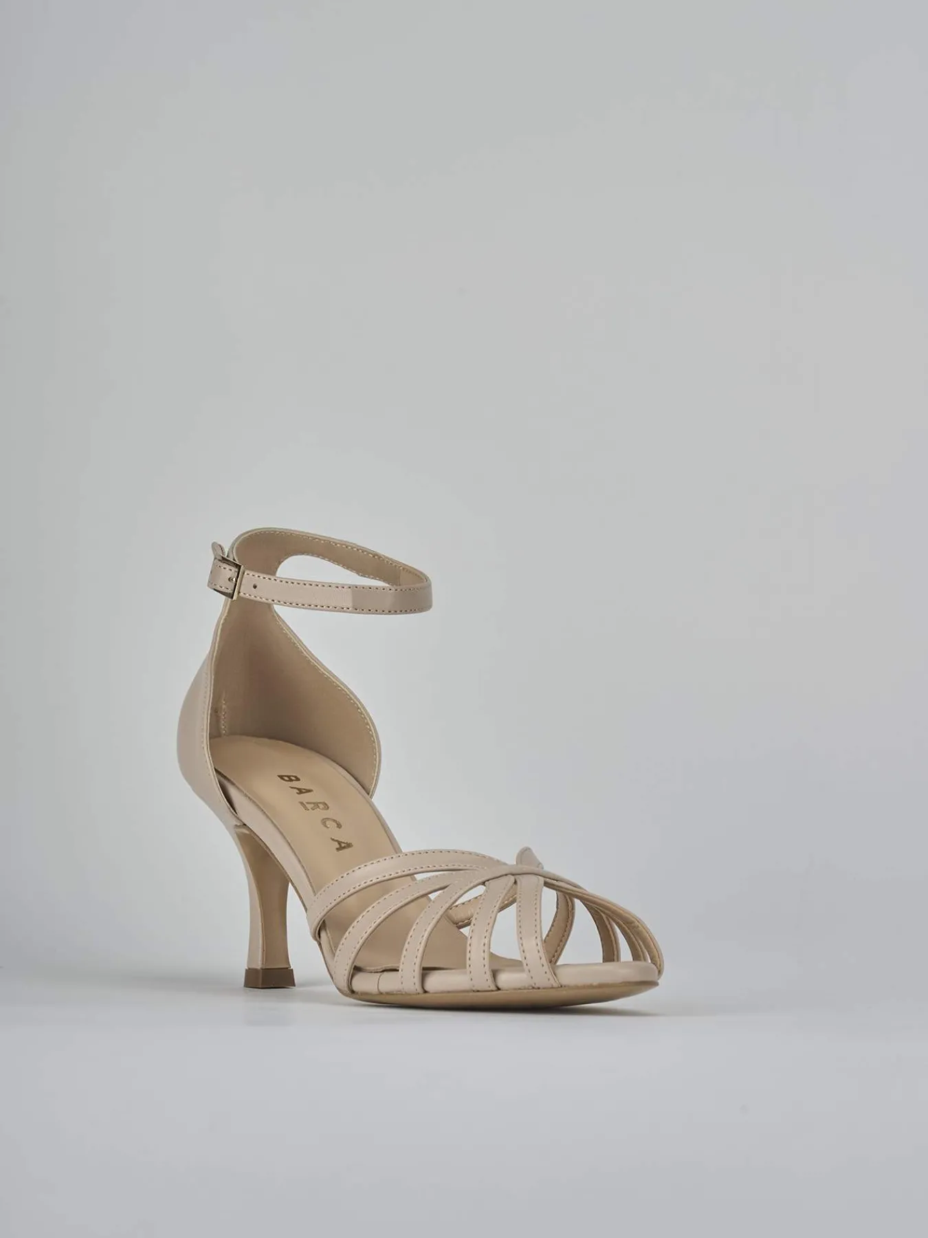 Sandalo tacco 7 cm, fondo in leggerissima gomma e soletto interno in vera pelle. Tomaia in morbida nappa, punta affusolata con fascia a cestina aperta in punta, cinturino in caviglia con fibbia regolabile e tallone chiuso. per un look so-cool!