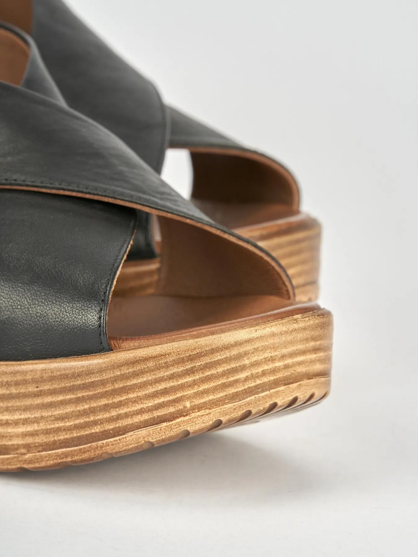 sandalo zeppa 6 cm, fondo in gomma e soletto interno in vera pelle. Tomaia in morbidissima pelle nappata incrociata con cinturino posteriore regolabile con un elastico, plateaux alto 3 cm.