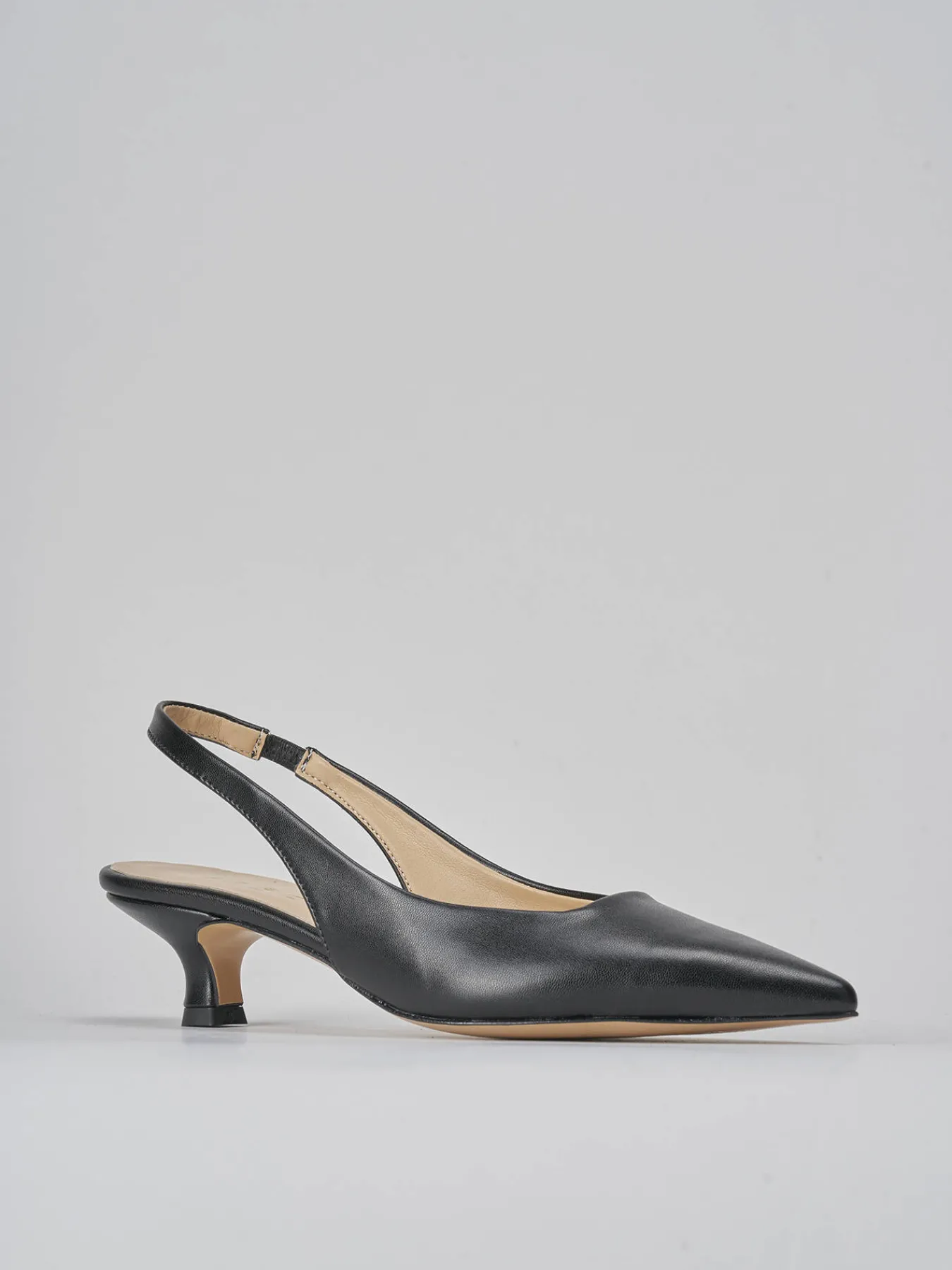 Slingback tacco 3 cm fondo in leggerissima gomma e soletto interno in vera pelle. tomaia in morbida pelle, punta sfilata, scollo squadrato, cinturino elasticizzato per il massimo del comfort e tacco rocchetto. perfetto e versatile con qualsiasi tuo outfit.