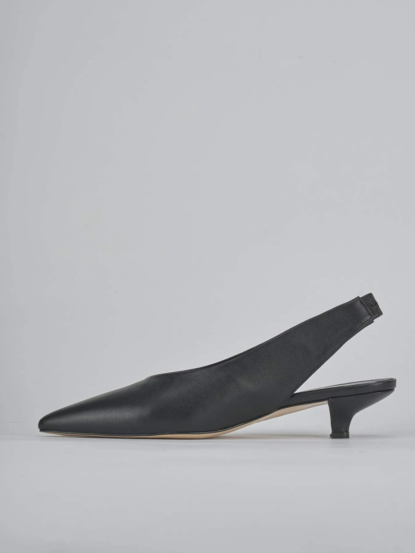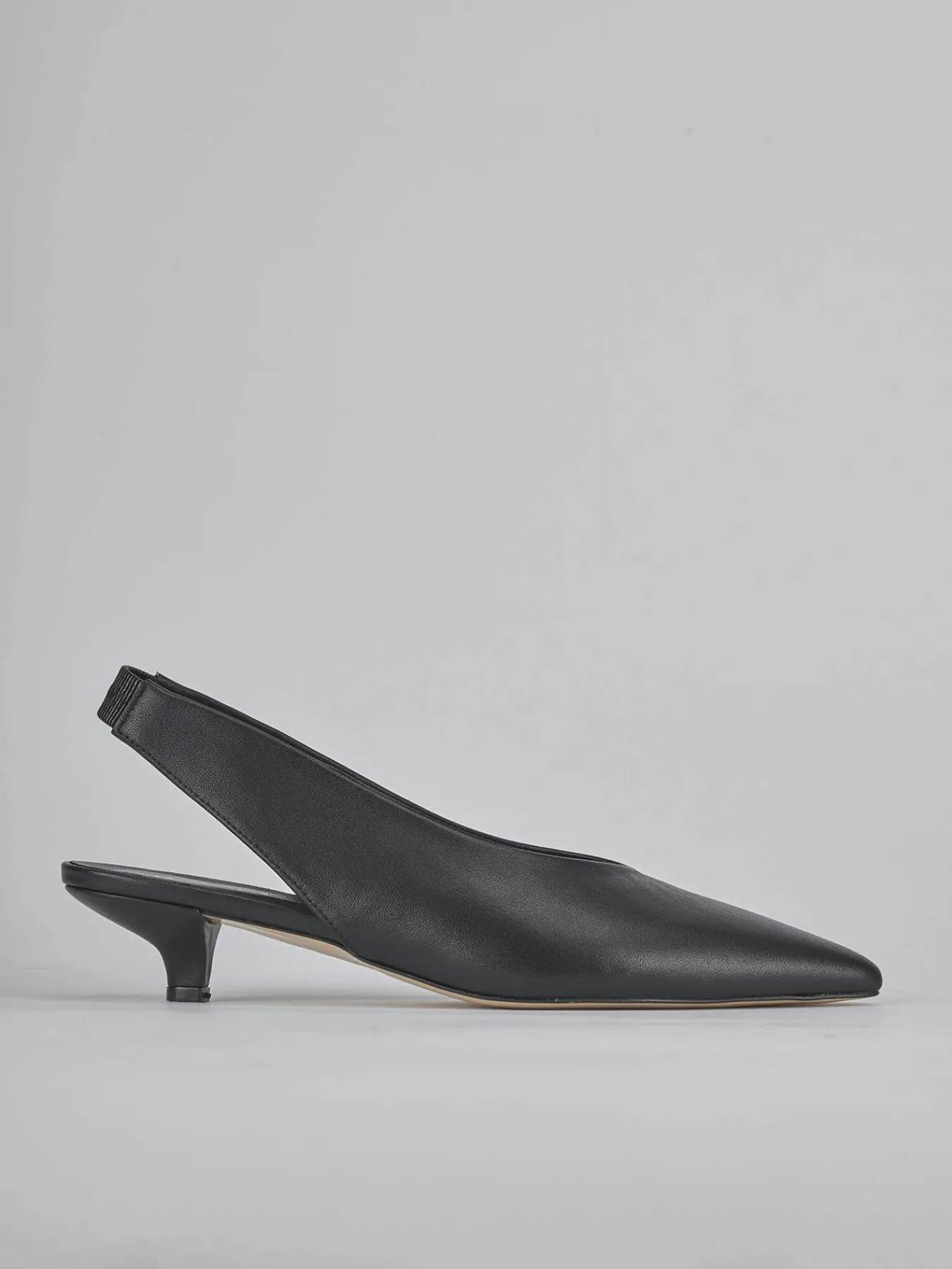 Slingback decolte’ tacco 4 cm fondo in leggerissima gomma e soletto interno in vera pelle. Tomaia in morbida pelle, punta sfilata, scollo a ‘V’, liscio, cinturino spesso elasticcizzato per una calzata su misura. Perfettoper un tocco chic ai tuoi look.