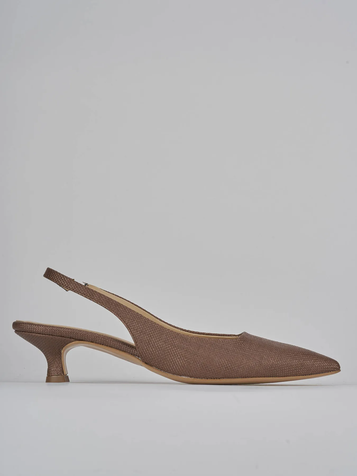 Slingback decolte’ tacco 4 cm fondo in leggerissima gomma e soletto interno in vera pelle. Tomaia in morbida pelle rivestita in tessuto, punta sfilata, scollo squadrato e nuovissimo tacco rocchetto. Perfetto per qualsiasi stagione.
