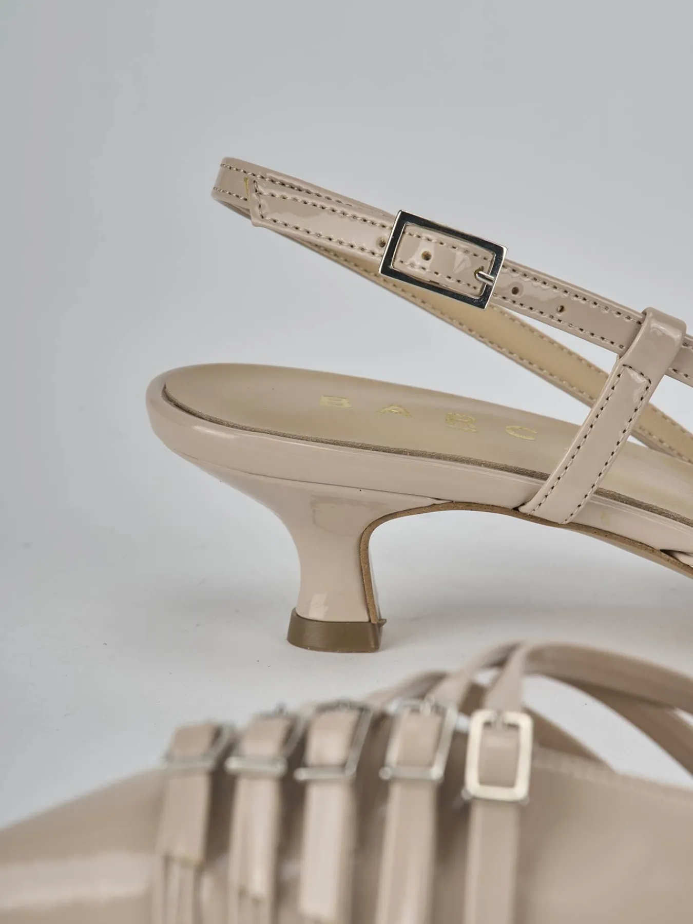 Slingback decolte’ tacco 4 cm fondo in leggerissima gomma e soletto interno in vera pelle. Tomaia in morbida pelle effetto verniciato, punta sfilata, puntale cinque cinturini con fibbia regolabile e cinturino in caviglia e tacco rocchetto. Perfetto sia con dei jeans che con una gonna.