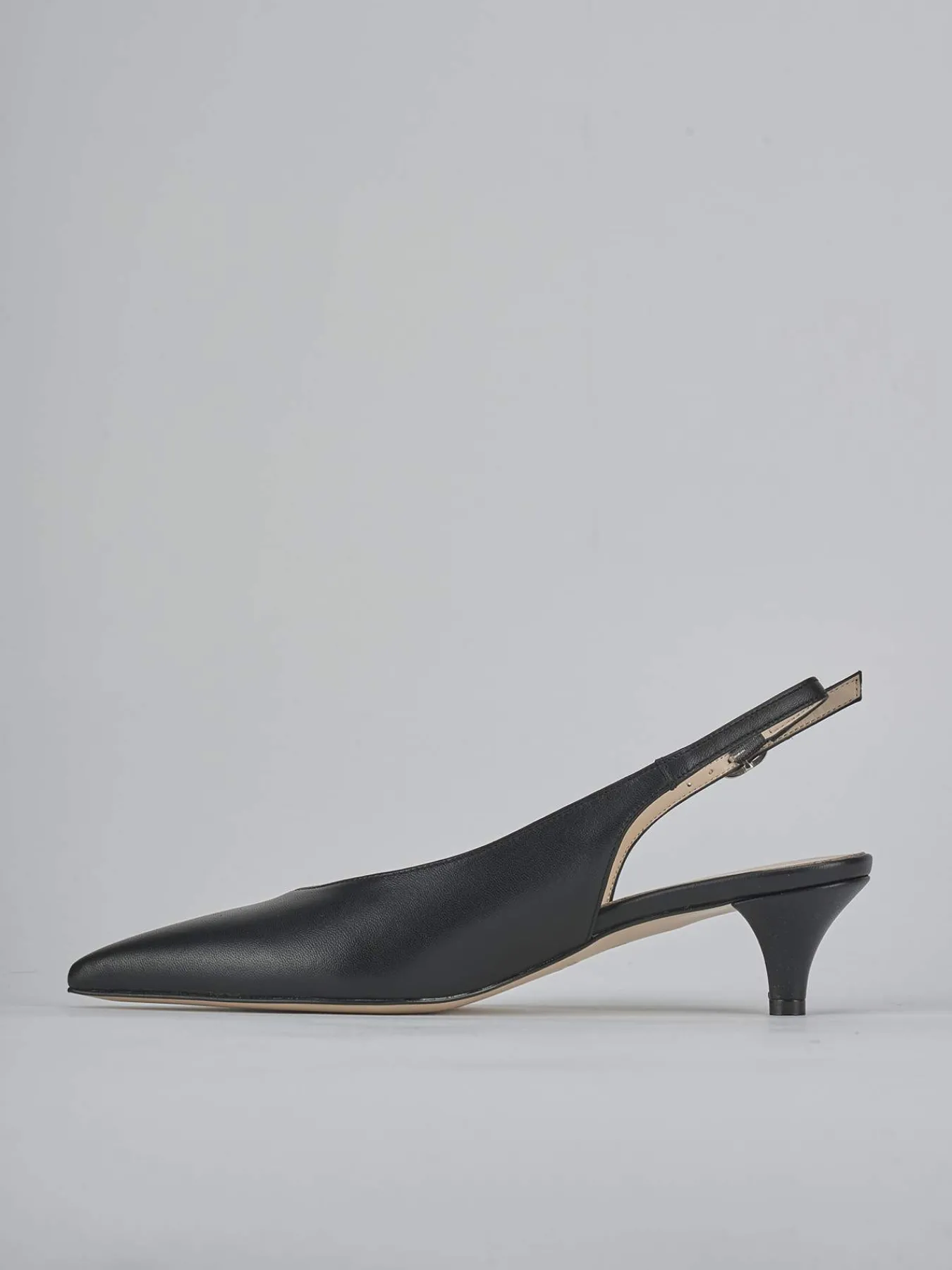 Slingback decolte’ tacco 4.5 cm fondo in cuoio e soletto interno in vera pelle. Tomaia in morbida pelle nappata, punta sfilata, scollo a ‘V’, liscio, cinturino sottile con fibbia regolabile e tacco nuovissimo a cono. Dal design ricercato che dura nel tempo.