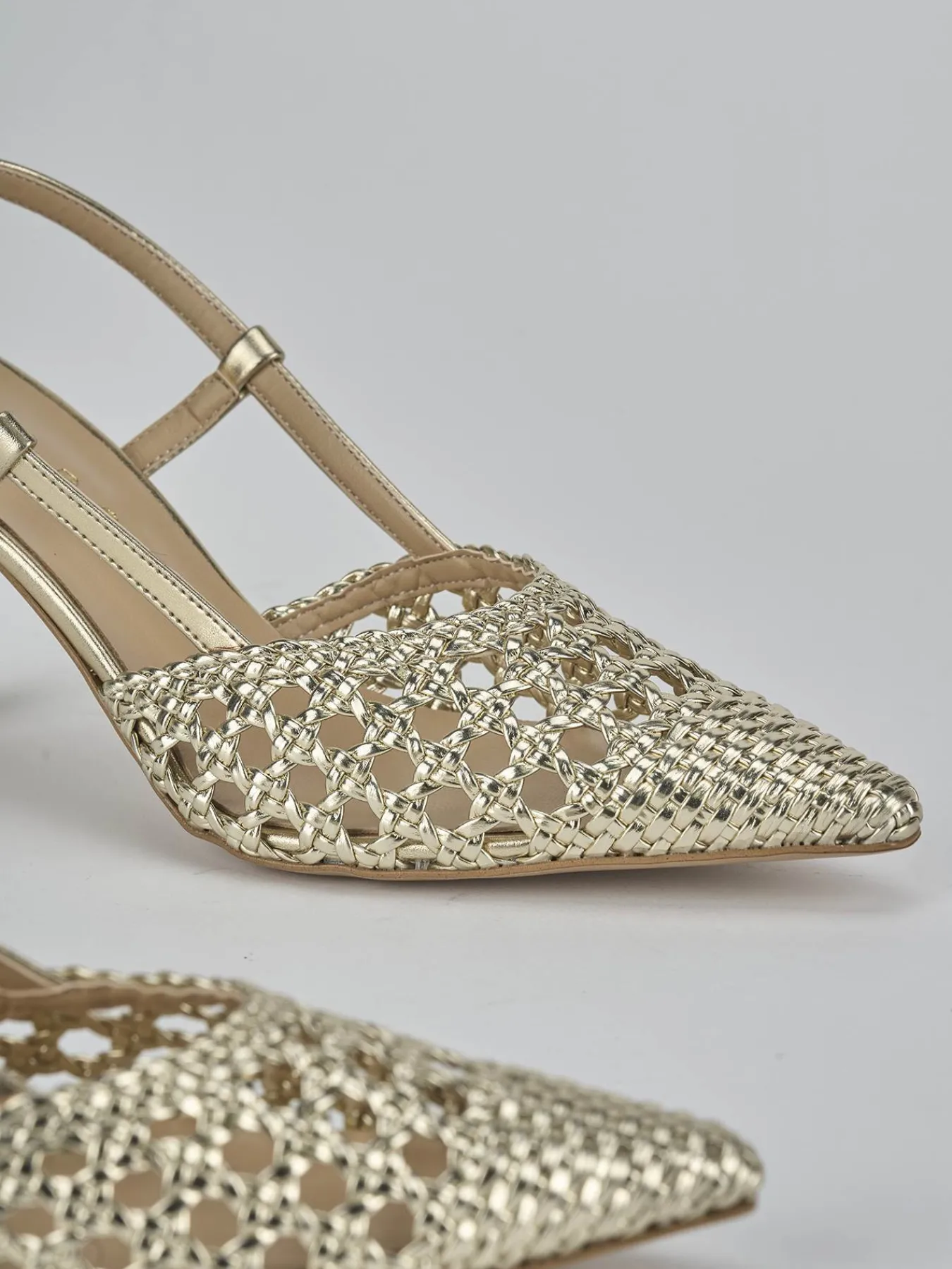 Slingback decolte’ tacco 7 cm fondo in leggerissima gomma e soletto interno in vera pelle. Tomaia in morbida pelle laminata finemente intrecciata, punta sfilata, rete, cinturino con fibbia regolabile e tacco rocchetto per un look chic.