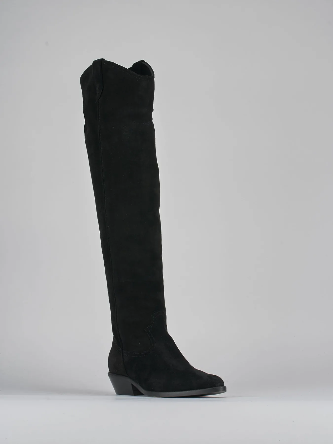 Stivale texano tacco 3,5 cm fondo in gomma e soletto interno in vera pelle. Tomaia in morbido camoscio, punta affusolata, comoda cerniera laterale, ghette, cuciture ben visibili e lungo gambale tubolare che misura appena sopra il ginocchio per un look texano cool.