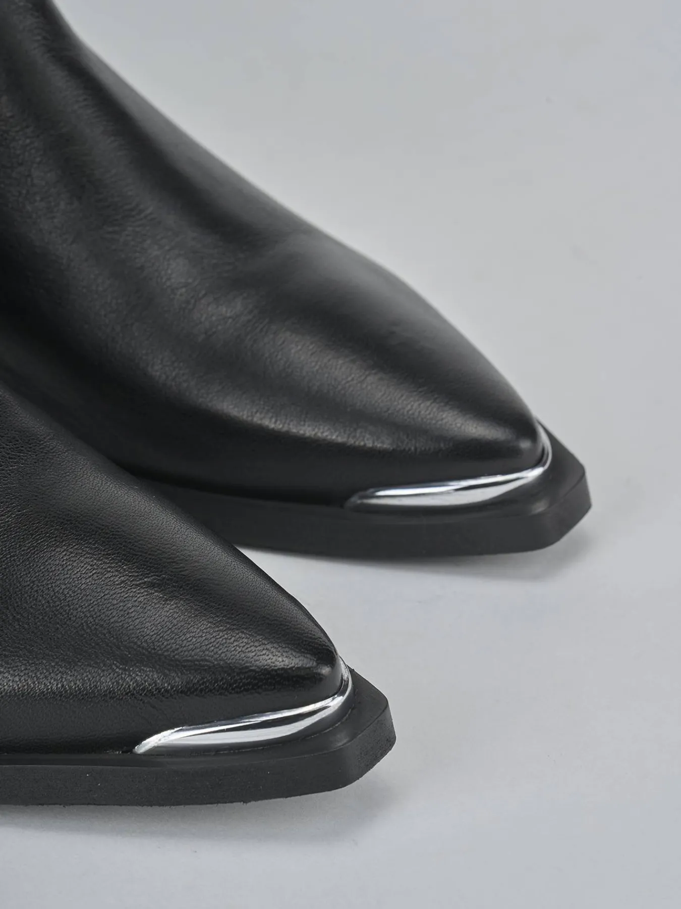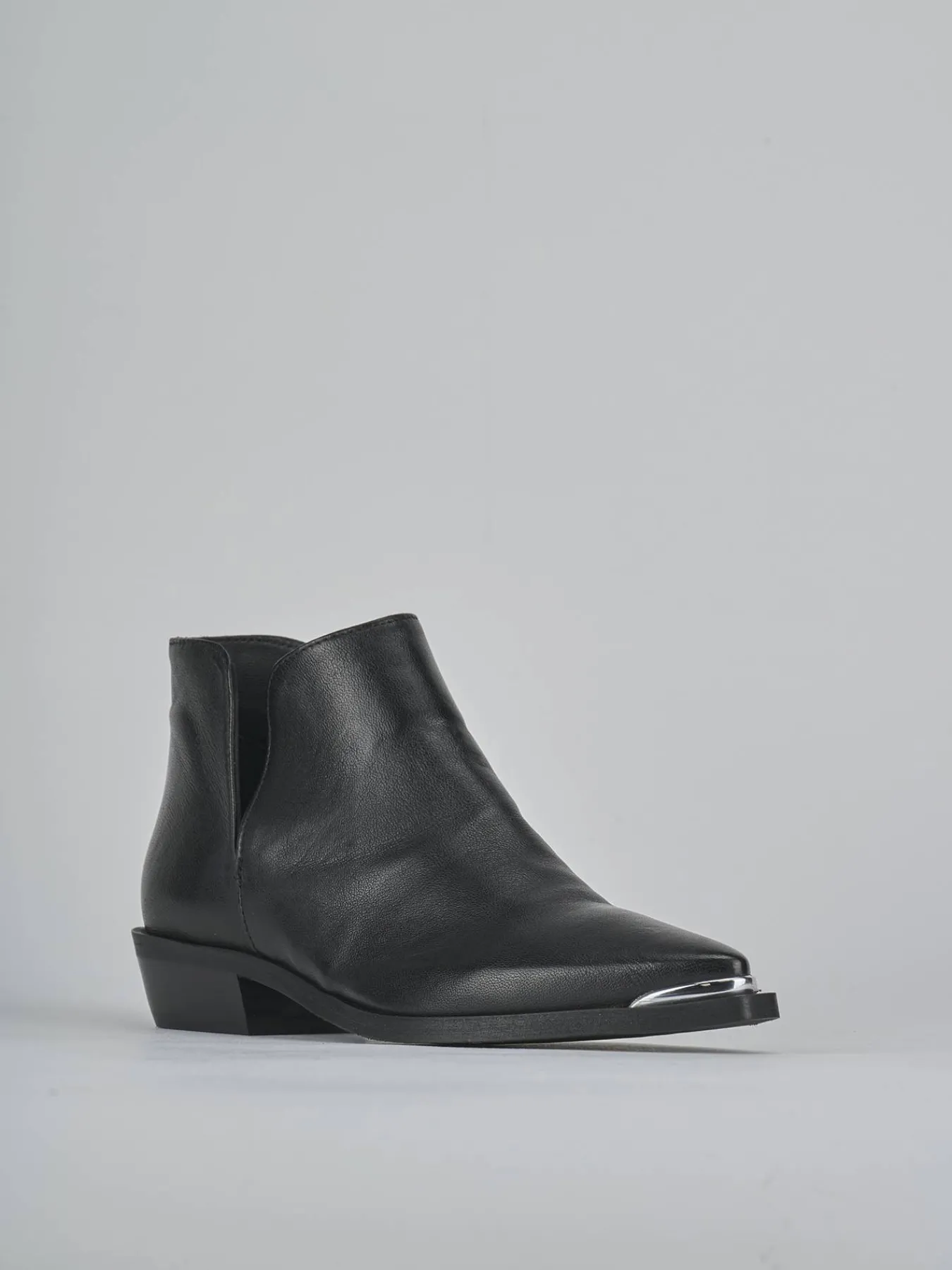 Stivaletto tacco 3 cm fondo in gomma e soletto interno in vera pelle. Tomaia in morbida pelle nappata, punta sfilata, cuciture a mano, apertura a ‘V’ sui lati e tacco stabile. Puntale in metallo per un tocco fierce ai tuoi look.