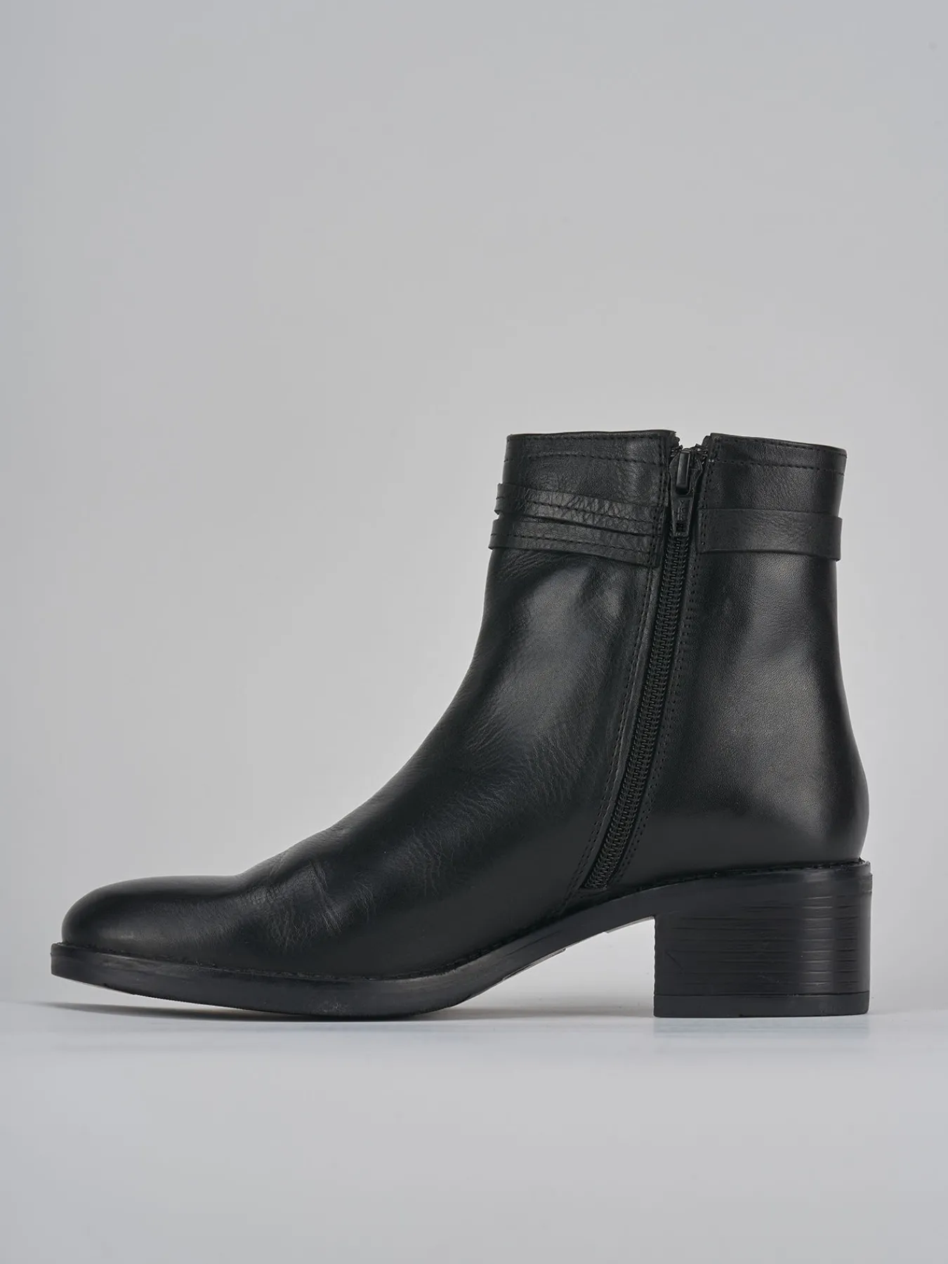 Stivaletto tacco 5 cm fondo in gomma e soletto interno in vera pelle. tomaia in morbida pelle, punta tonda, comoda cerniera laterale e fascia in pelle con accessorio in metallo in caviglia. adatto sia per andare al lavoro che per fare aperitivo con le amiche.