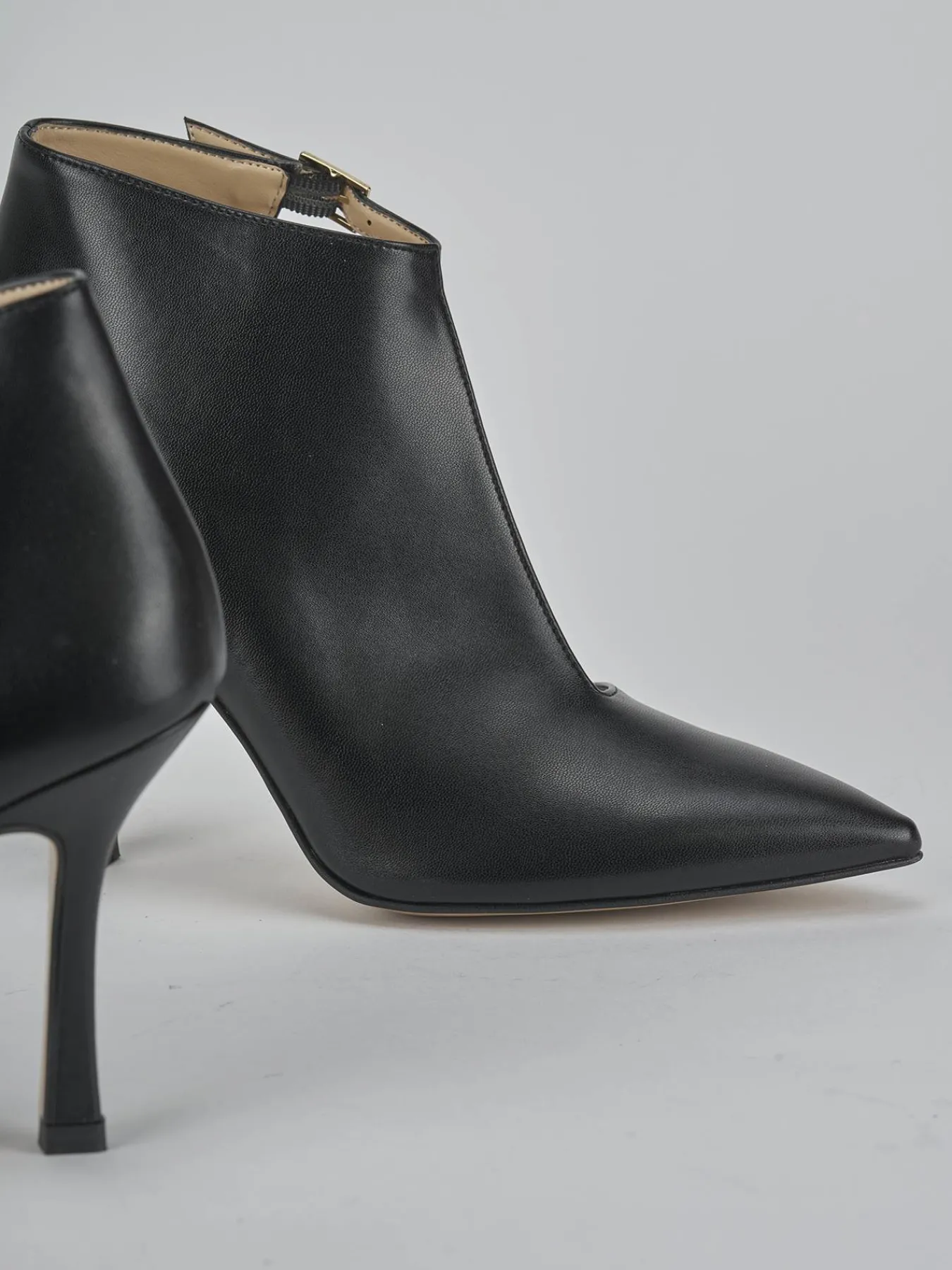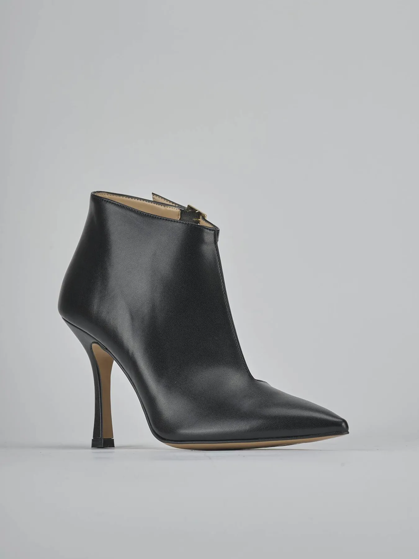 Stivaletto tacco 9 cm fondo in leggerissima gomma e soletto interno in vera pelle. Tomaia in morbida pelle, punta sfilata, aperta lateralmente, cinturino fibbia regolabile e tacco rocchetto per un look cool.