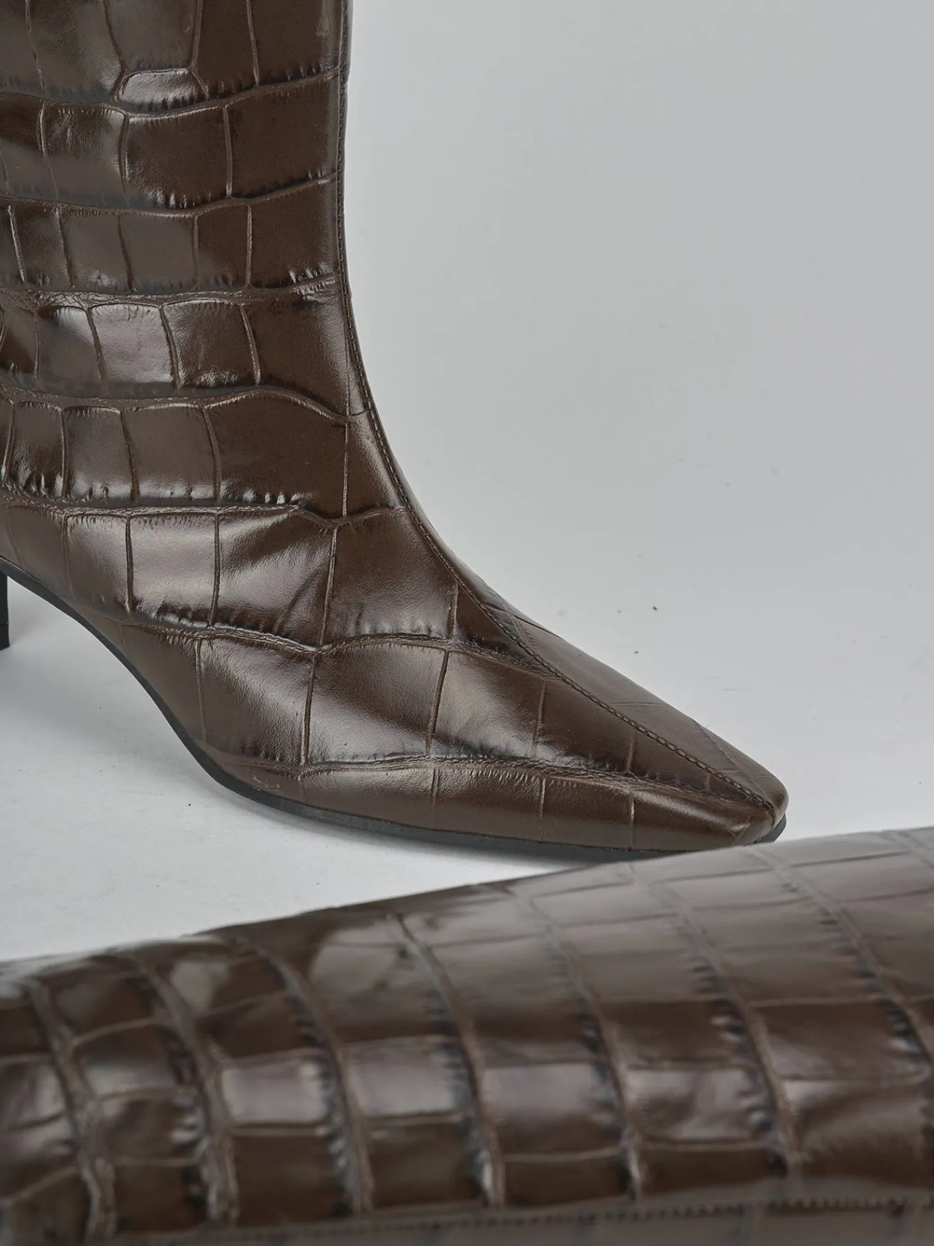 La punta sfilata e le cuciture a mano sul gambale tubolare, che arriva appena sotto il ginocchio, conferiscono un aspetto chic e curato.