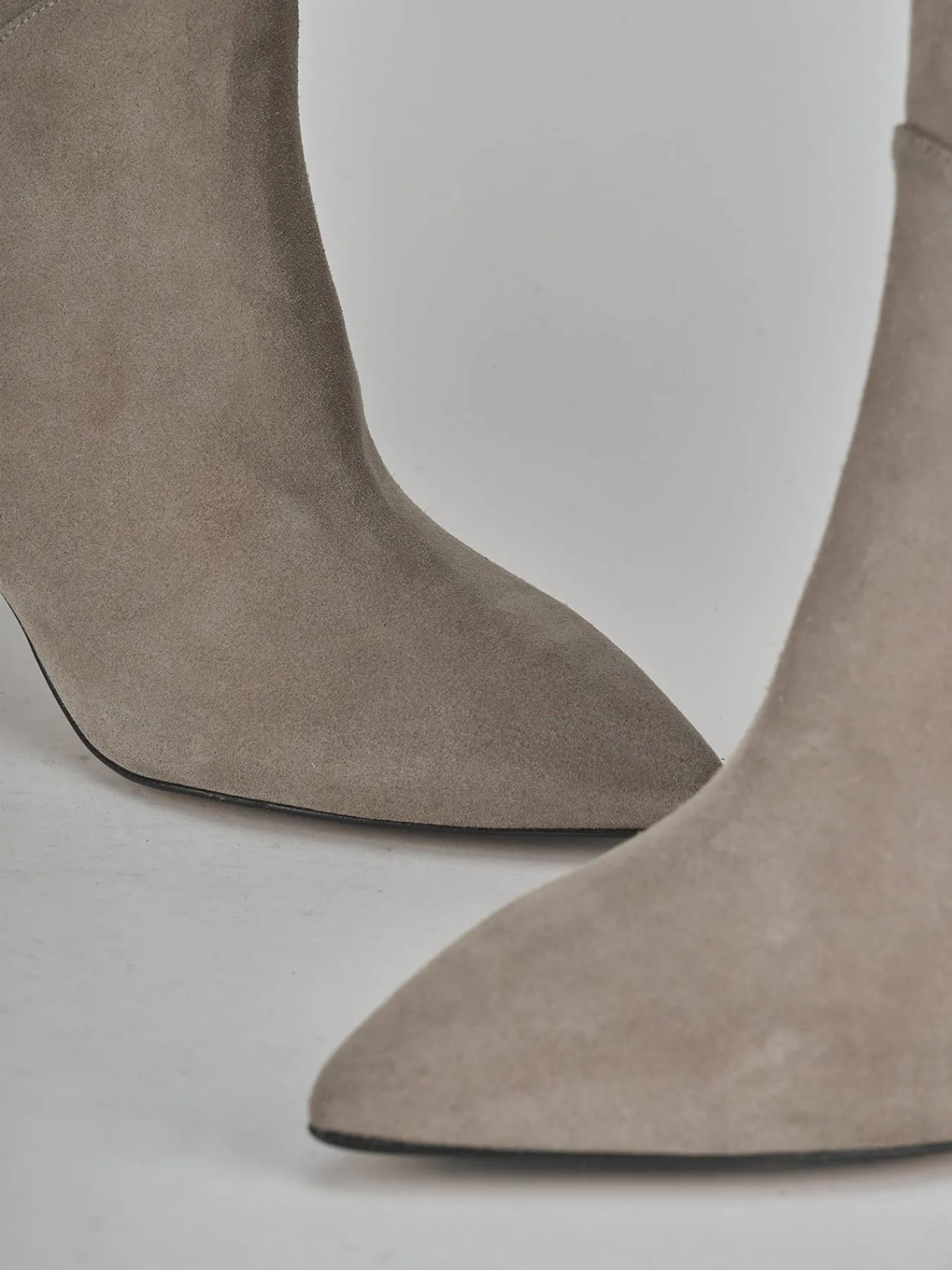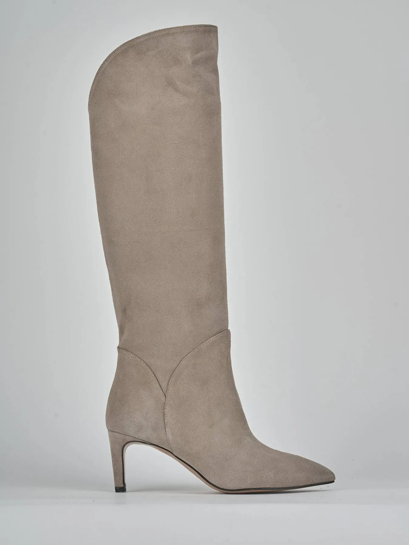 La tomaia in morbido camoscio avvolge delicatamente la gamba, mentre le cuciture a mano visibili sul gambale conferiscono un dettaglio artigianale unico.
