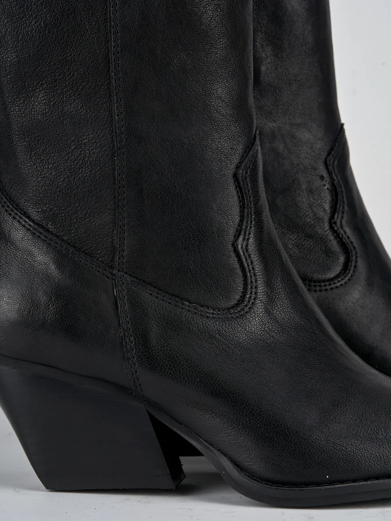 Stivale texano tacco 6.5 cm fondo in leggerissima gomma e soletto interno in vera pelle. tomaia in morbido camoscio, punta sfilata, cuciture a vista, piccolo spacco a ‘V’ frontale, cerniera laterale, ghette per sostenere gambale che misura appena sotto il ginocchio e tacco cubano. Perfetto per le tue occasioni più speciali.