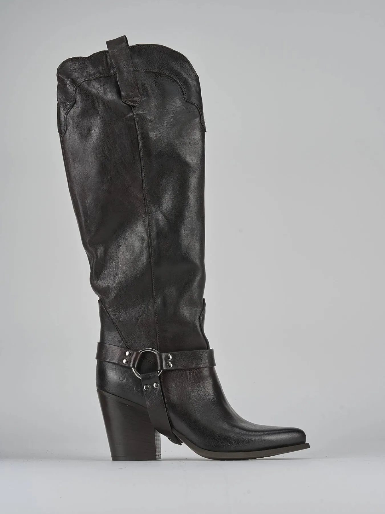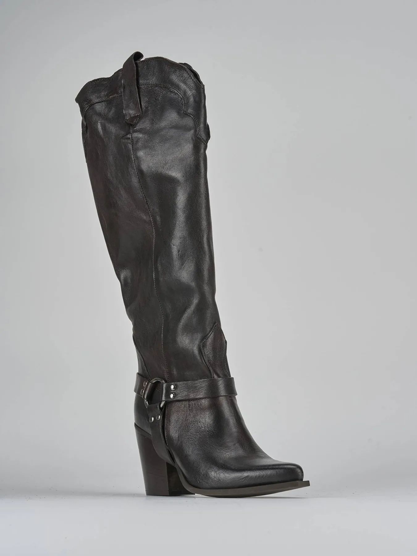 La punta sfilata e le cuciture a mano sul gambale, che arriva appena sotto il ginocchio, donano un look sofisticato e alla moda.