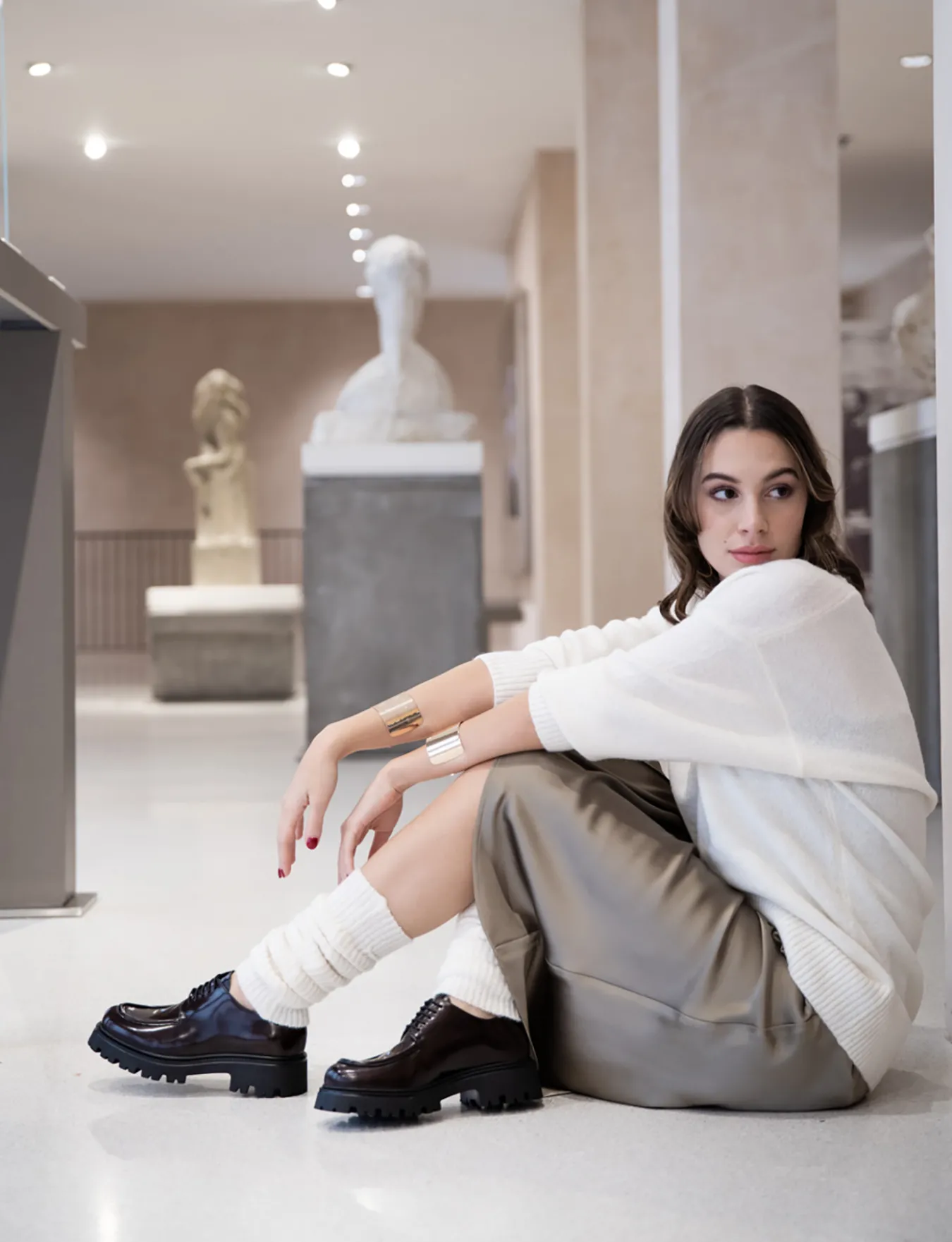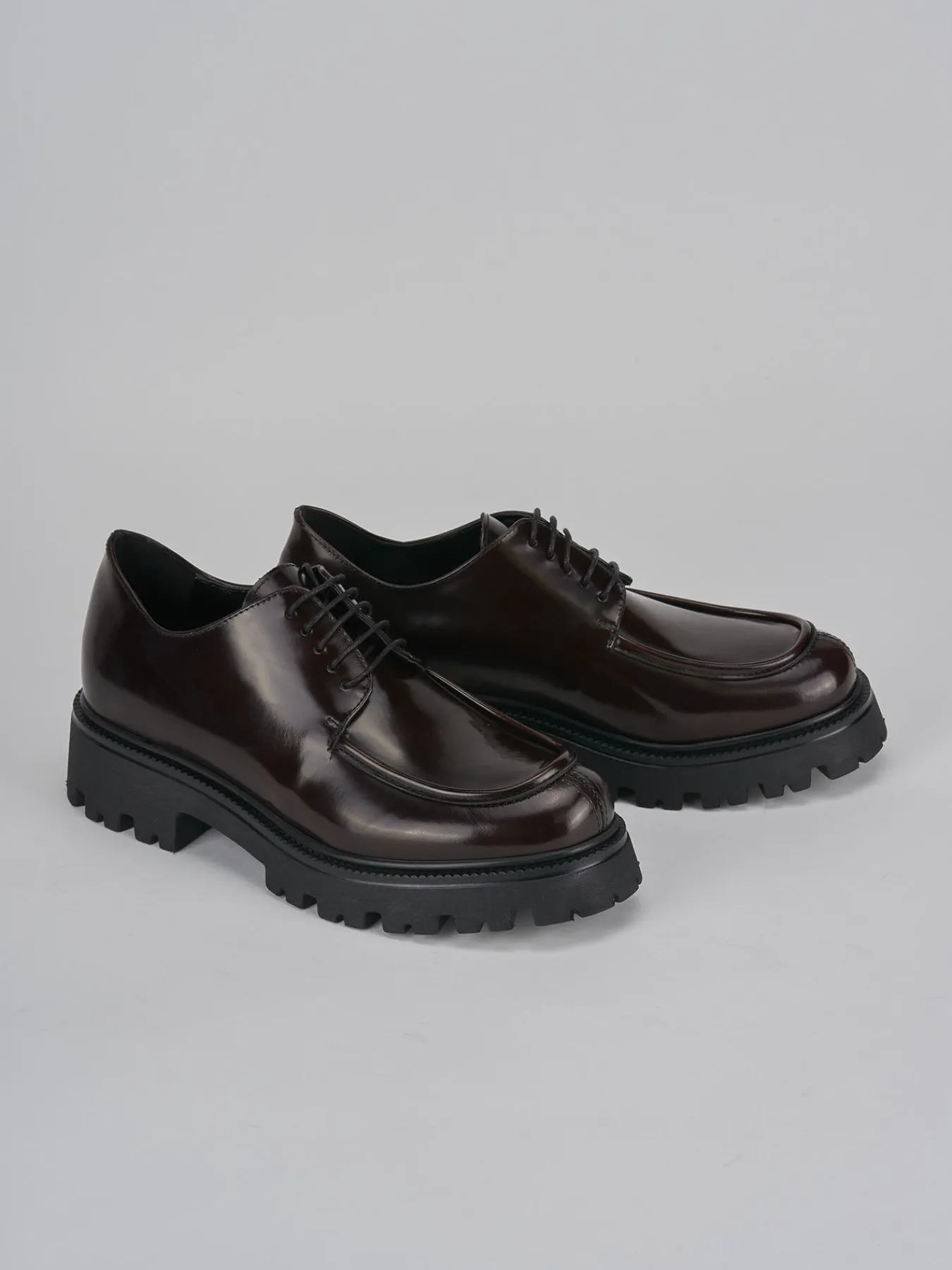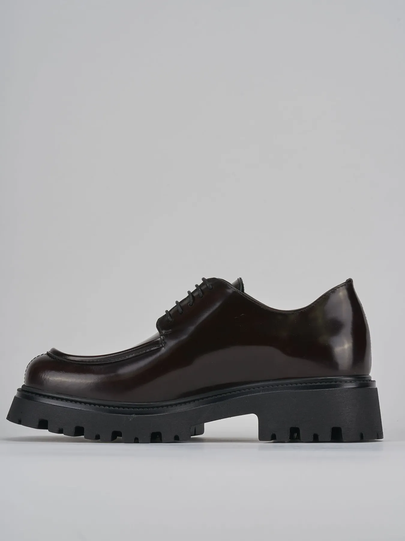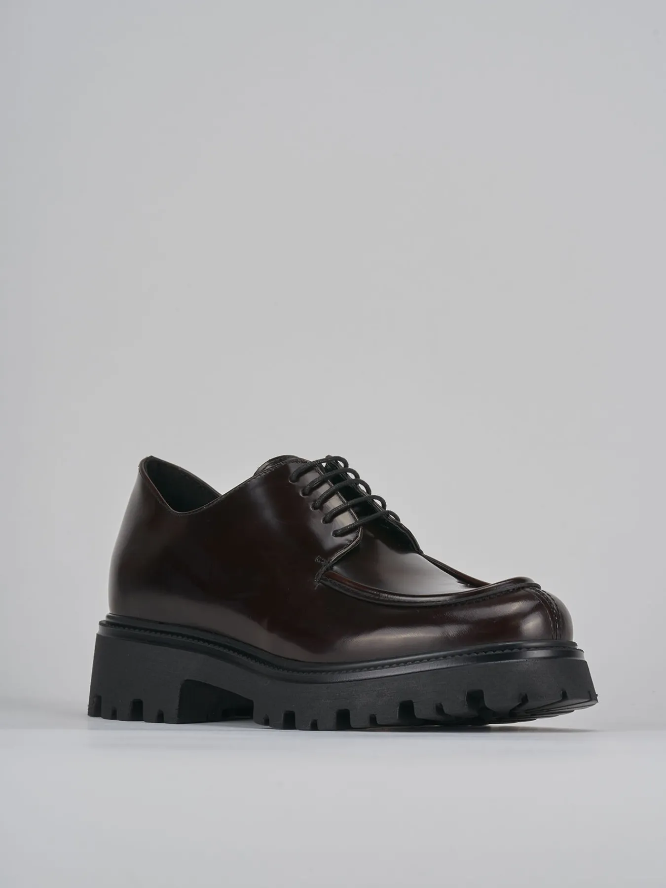 Stringata tacco 2 cm fondo in gomma e soletto interno in vera pelle. Tomaia in morbida pelle effetto lucido, punta squadrata, lace, cuciture visibili e alla norvegese e particolare fondo seghettato per una scarpa versatile dall’anima sporty-chic.