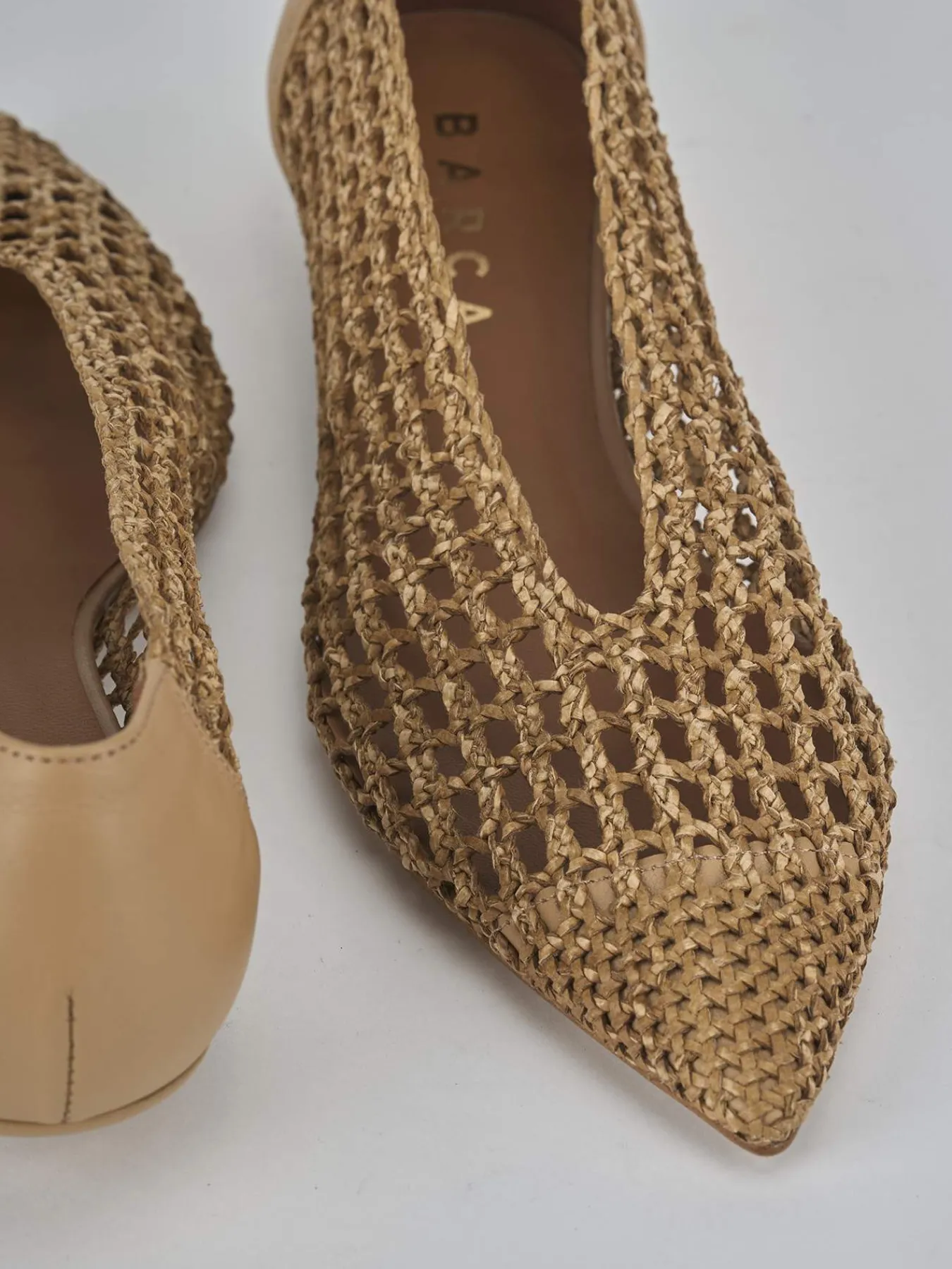 La tomaia è realizzata in morbida pelle finemente intrecciata, arricchita da inserti in tessuto che donano un tocco di raffinatezza.